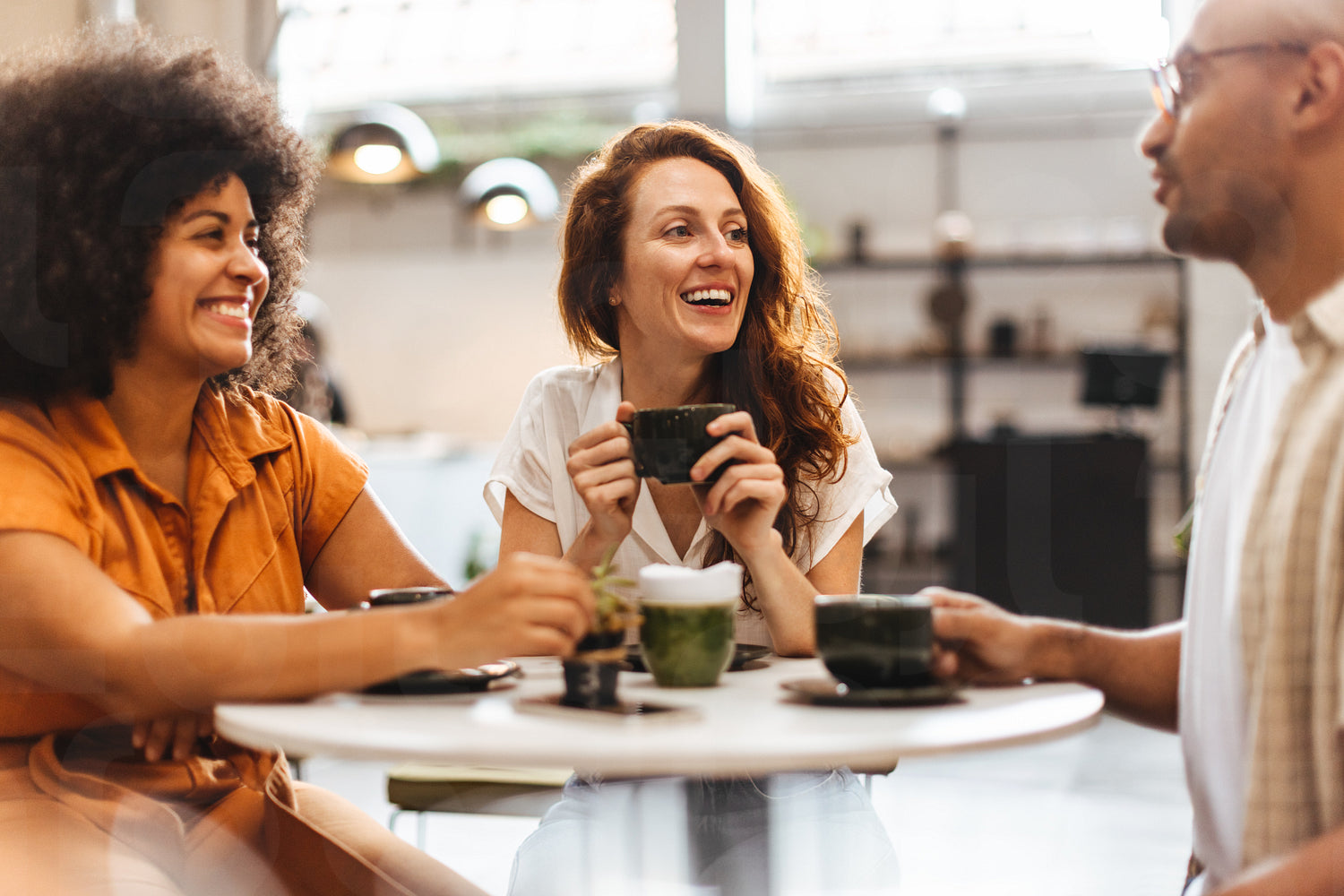 Group of friends catch up over coffee in a cozy cafe, taking a break from their busy lives to spend time together and reconnect. Happy young people gathering in a relaxed and social environment.