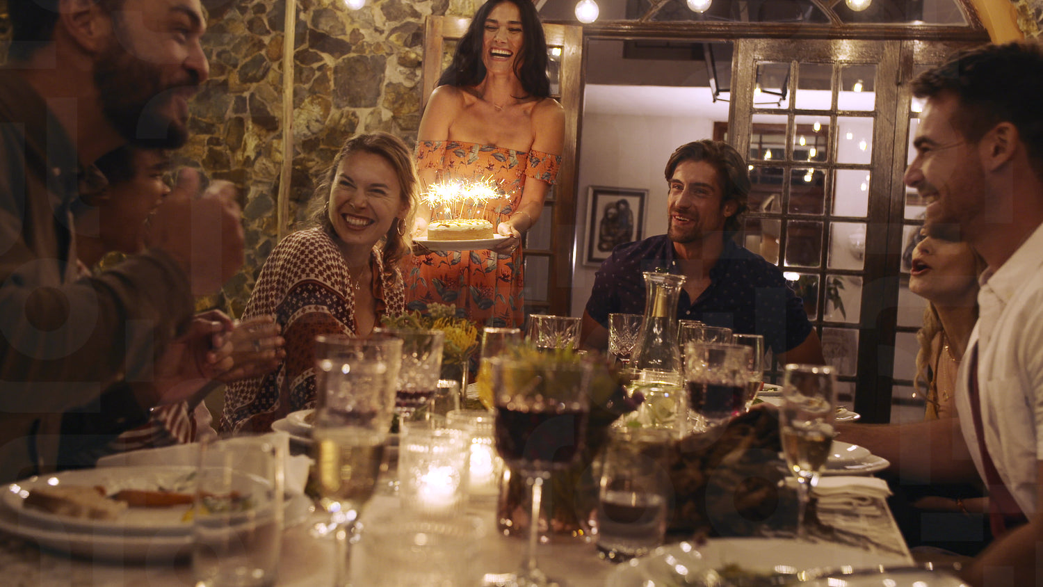 Woman giving a birthday cake to female friend at a dinner party. Group of friends celebrating birthday with cake.