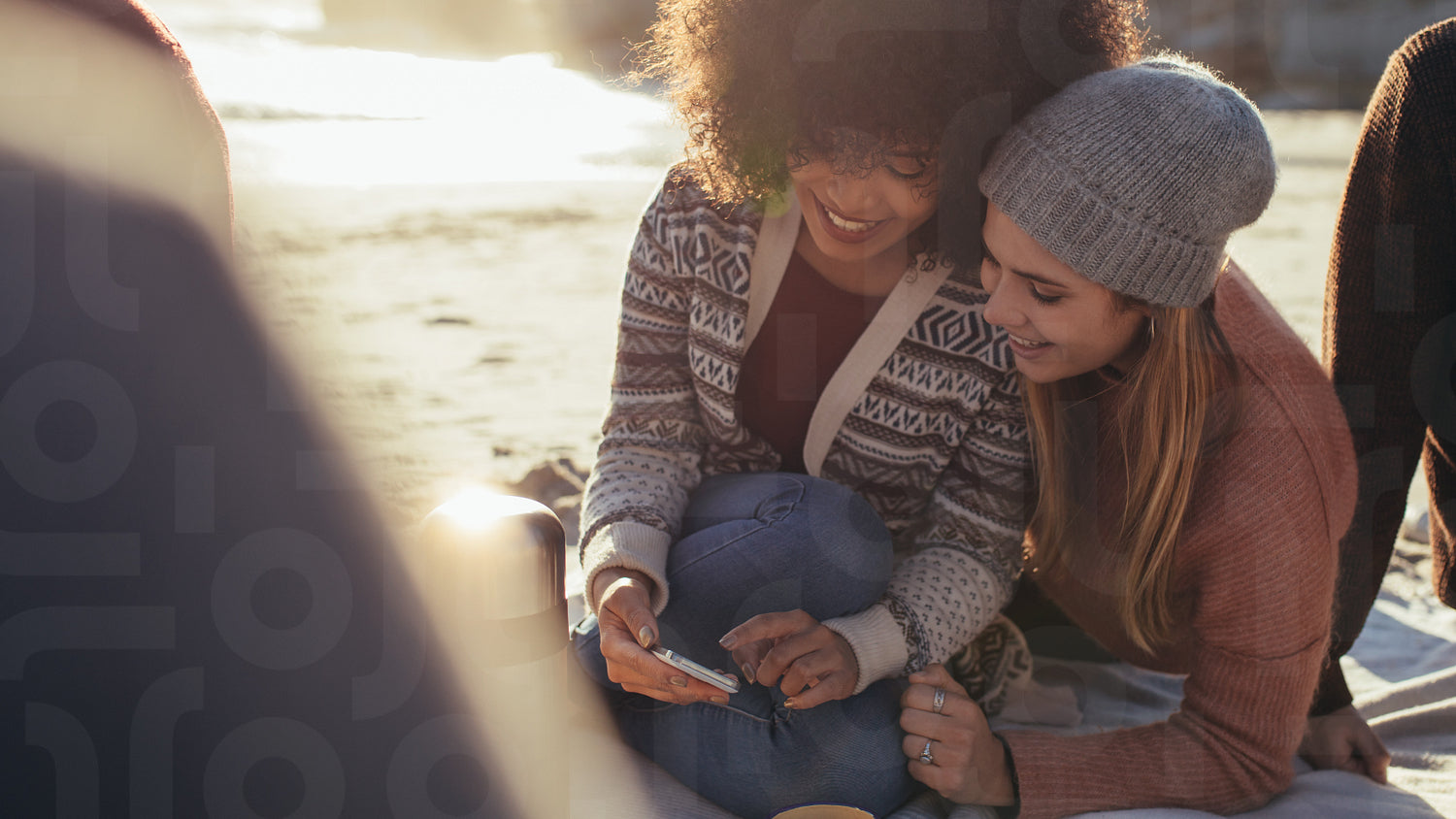 Young friends enjoying a beach party using mobile phone and smiling. Two young woman looking something funny on the smartphone and smiling.