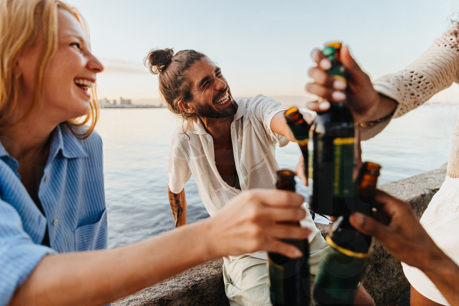 A group of friends share a joyful moment, clinking bottles as they enjoy a vibrant sunset at Mureta Da Urca. The setting sun casts a warm glow, enhancing the spirited scene.