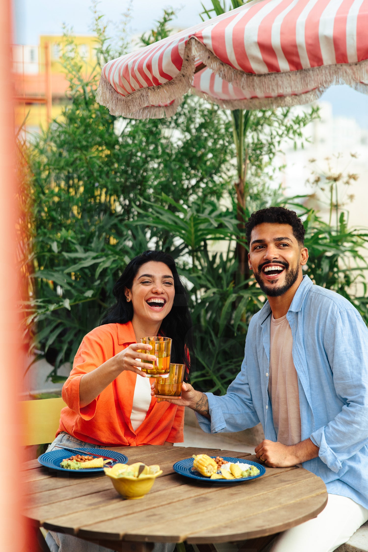 A cheerful Latin American couple enjoys an outdoor meal together under a colorful umbrella, toasting drinks and laughing, portraying happiness, togetherness, and the joy of a shared dining experience.