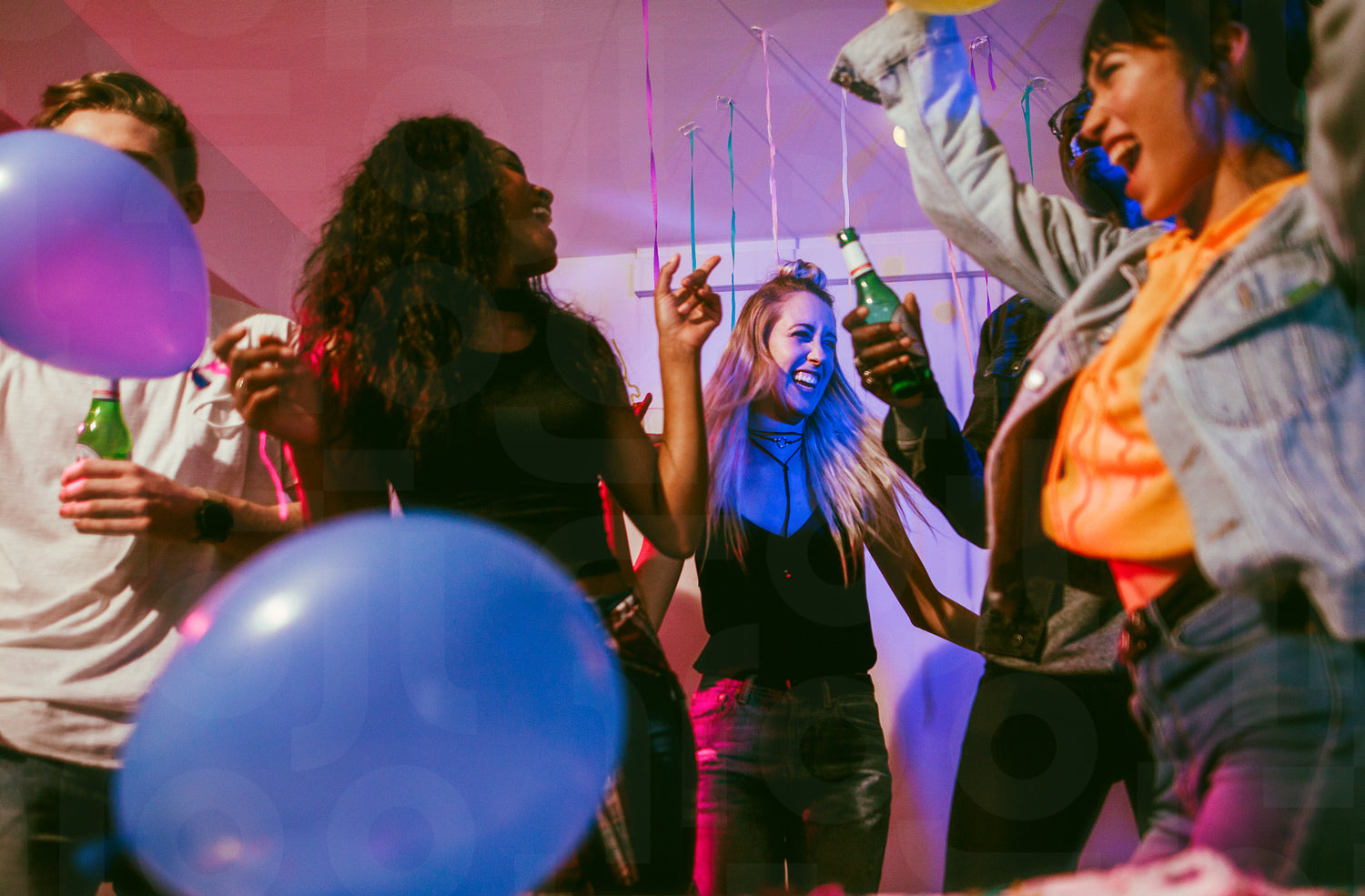 Young men and women having fun at a colorful house party with decorations and confetti all around. Friends dancing and celebrating holding drinks at a house party.