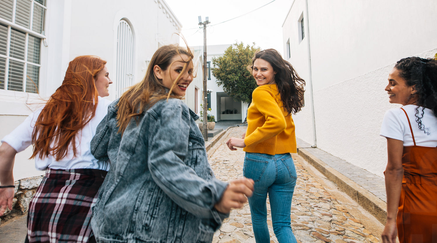 Group of beautiful four women friends running outdoors. Diverse group of women enjoying on the street.