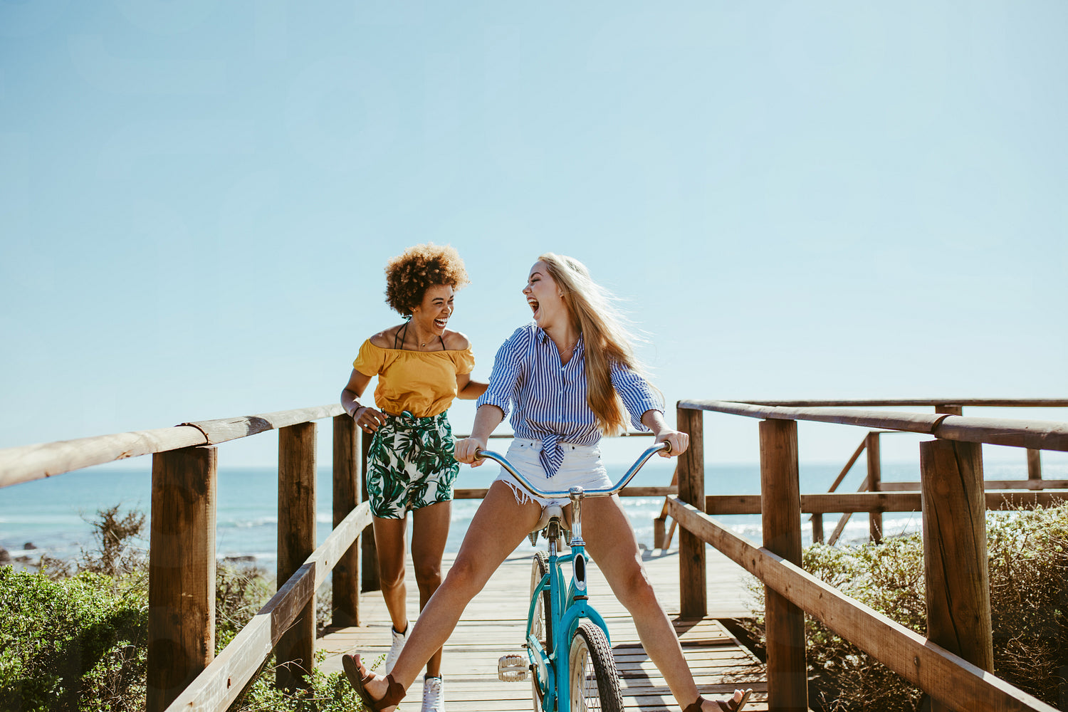 Young woman riding bike on boardwalk with friend running by. Multi-ethnic girls having fun with a bike at the seaside boardwalk.