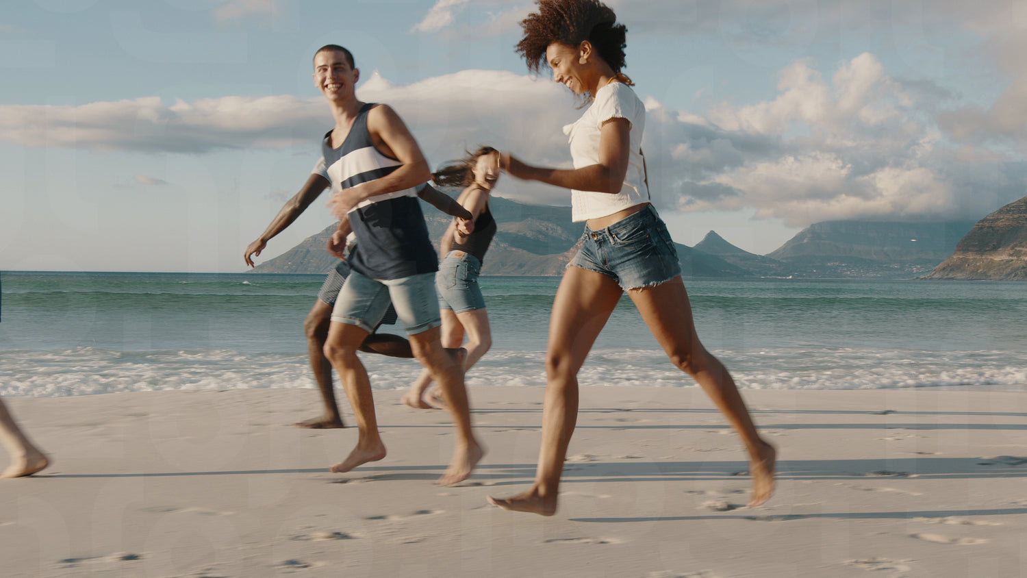 Group of multi-ethnic friends running and enjoying on the beach. Carefree young people having a great time together on a vacation.
