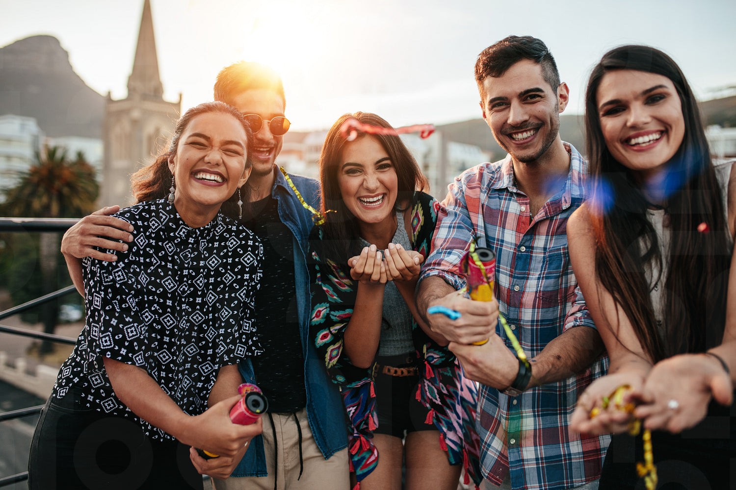 Group of friends hanging out together on rooftop party. Young people enjoying at party with confetti.