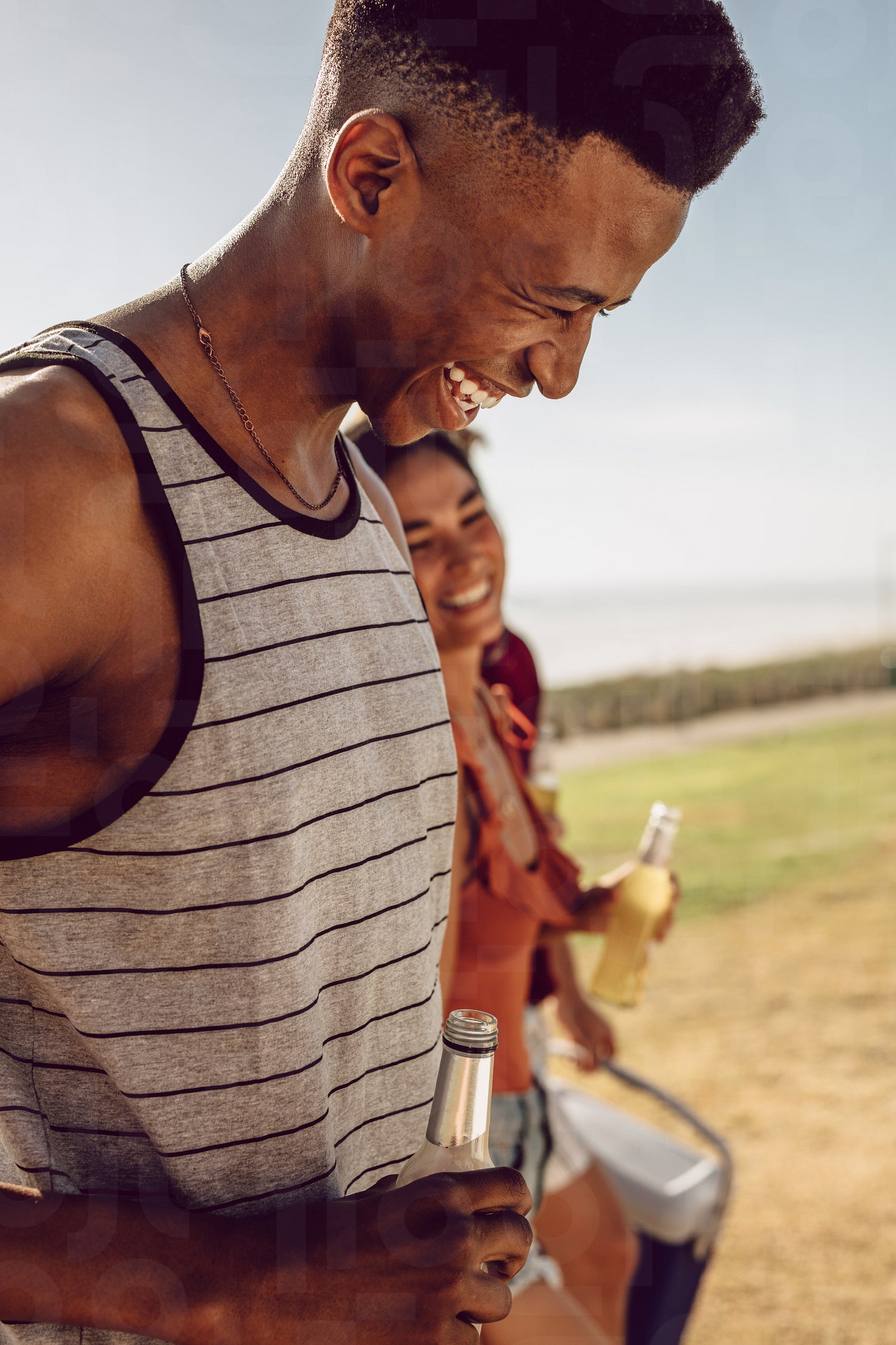 Friends having beers while walking to the picnic spot