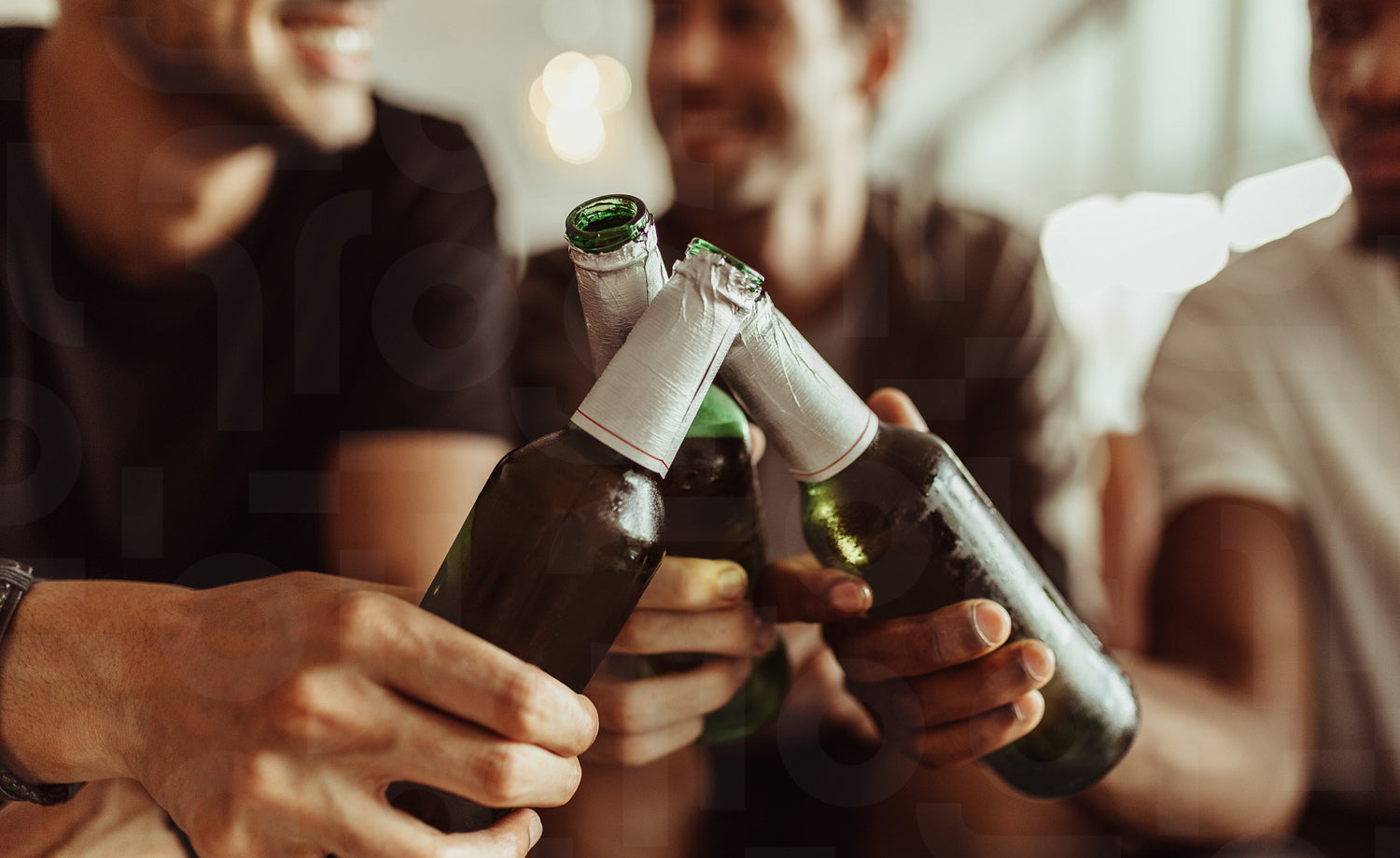 Close up of three friends toasting their bottles of beer while having a party at home. Men raising their bottles for a toast sitting at home.