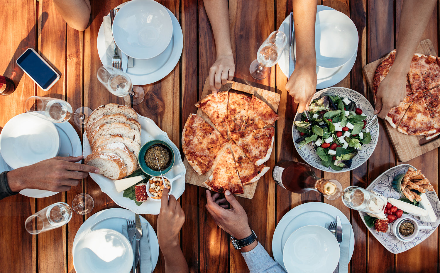 Top view of group of friends having food and drinks. Enjoying the food at housewarming party.