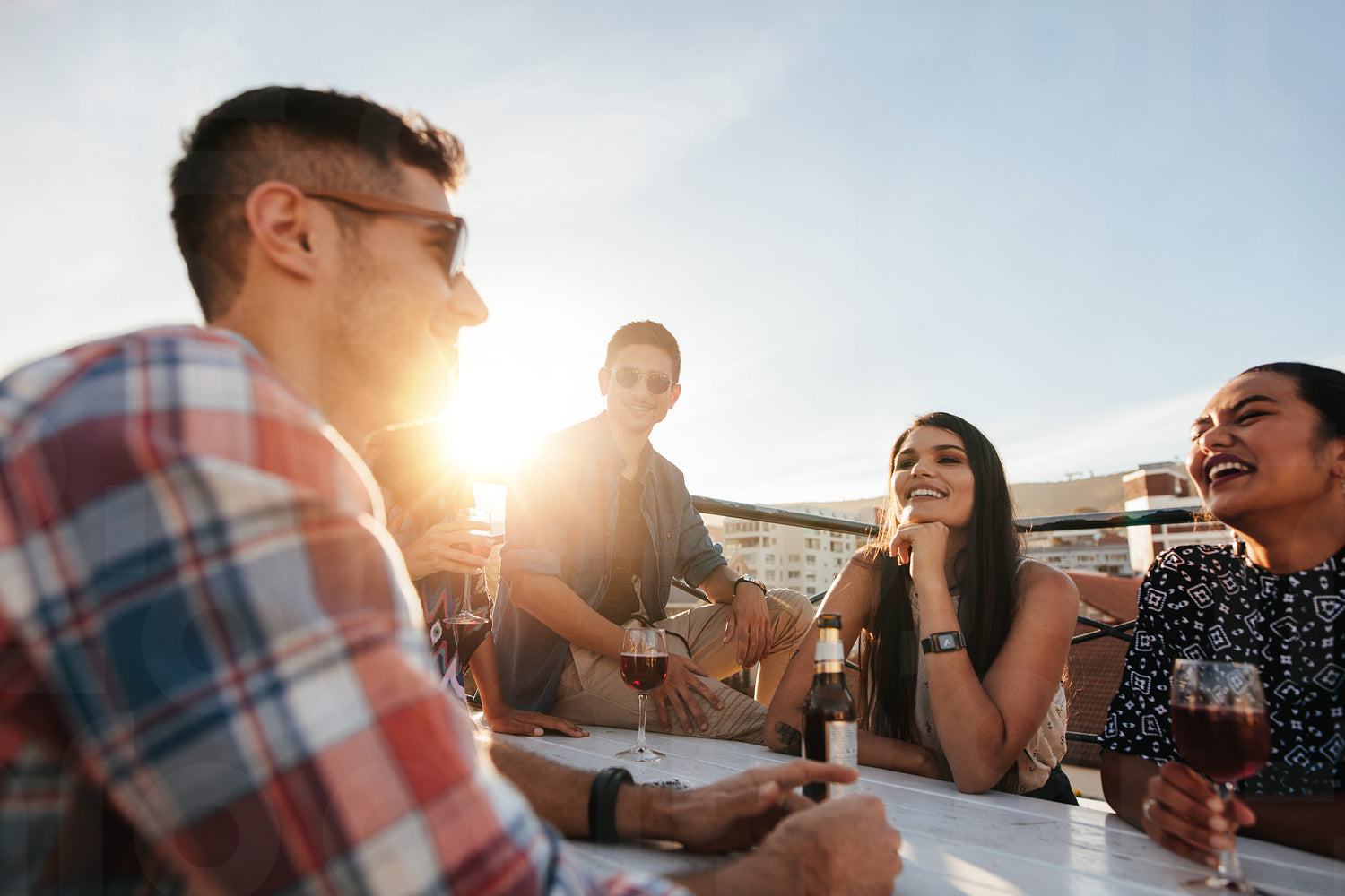 Shot of young woman having a rooftop party with friends. Friends party gathering on rooftop.