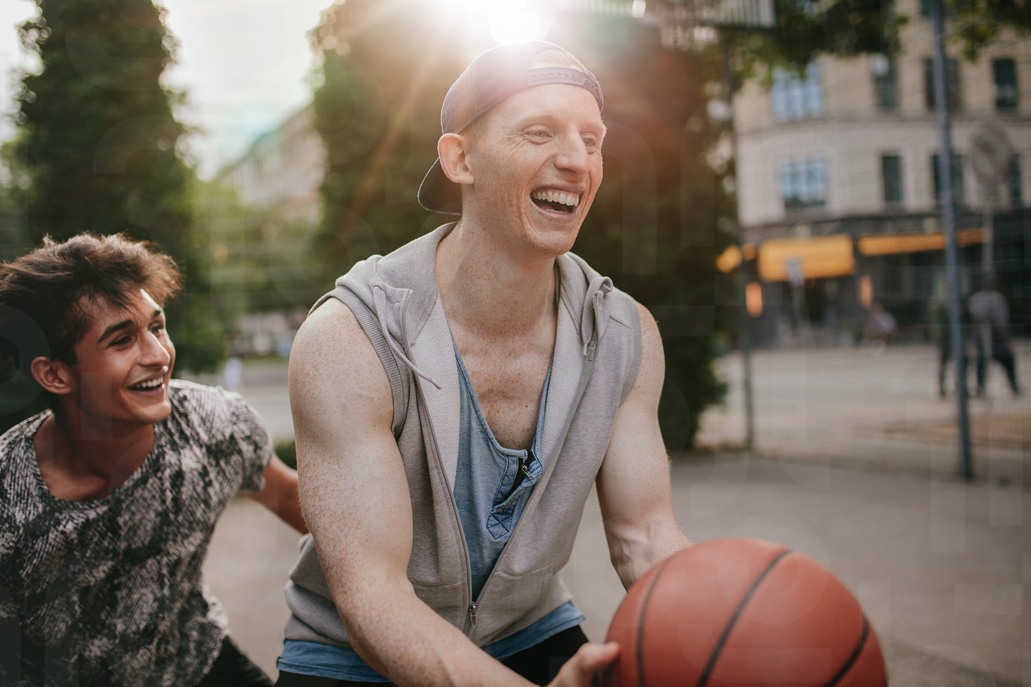 Two young friends playing basketball and having fun. Streetball players having a game of basketball on court outdoors.