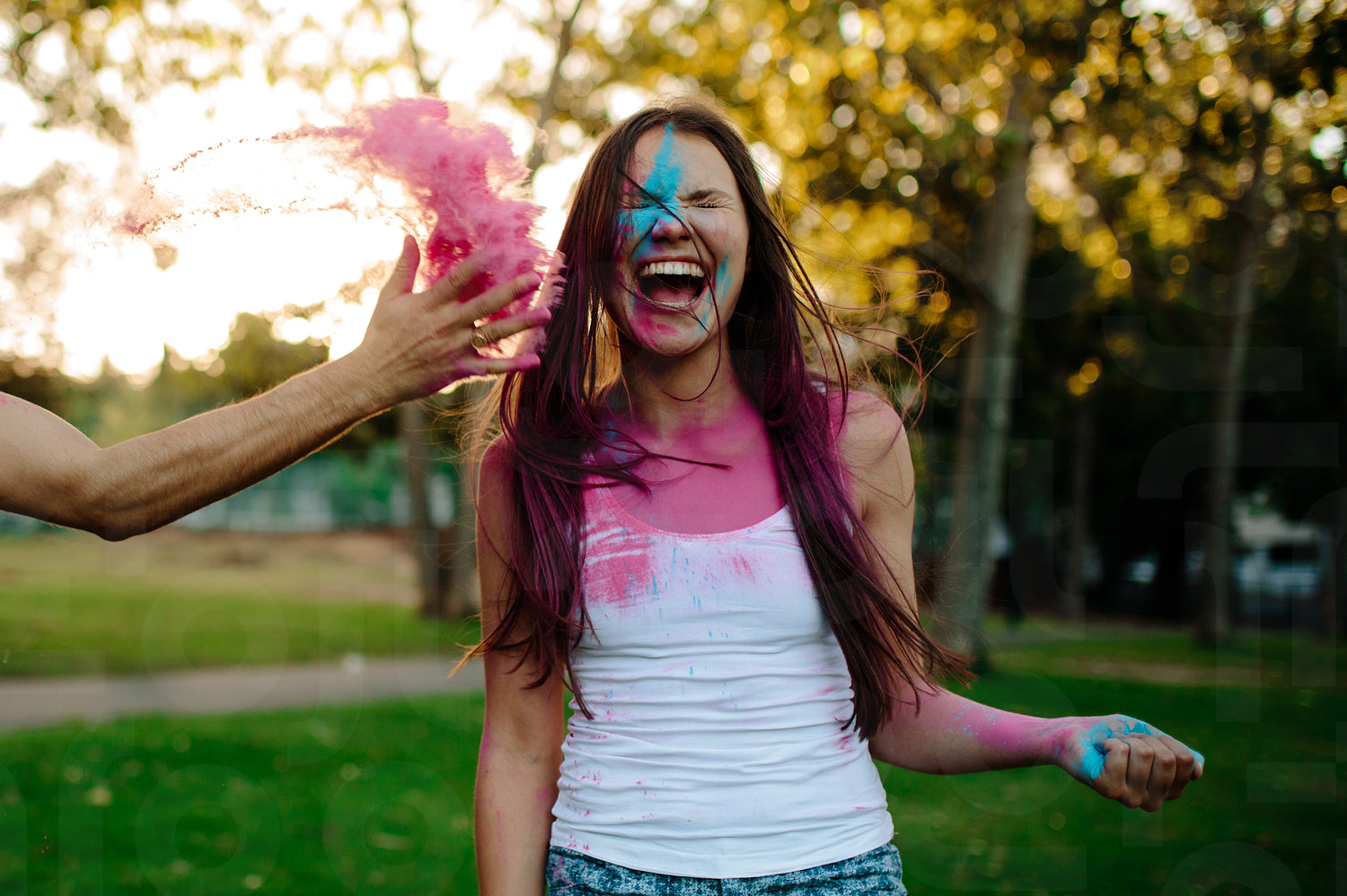 Woman in park laughing while male friend throwing color powder on her face. Friends playing with holi festival at the park.