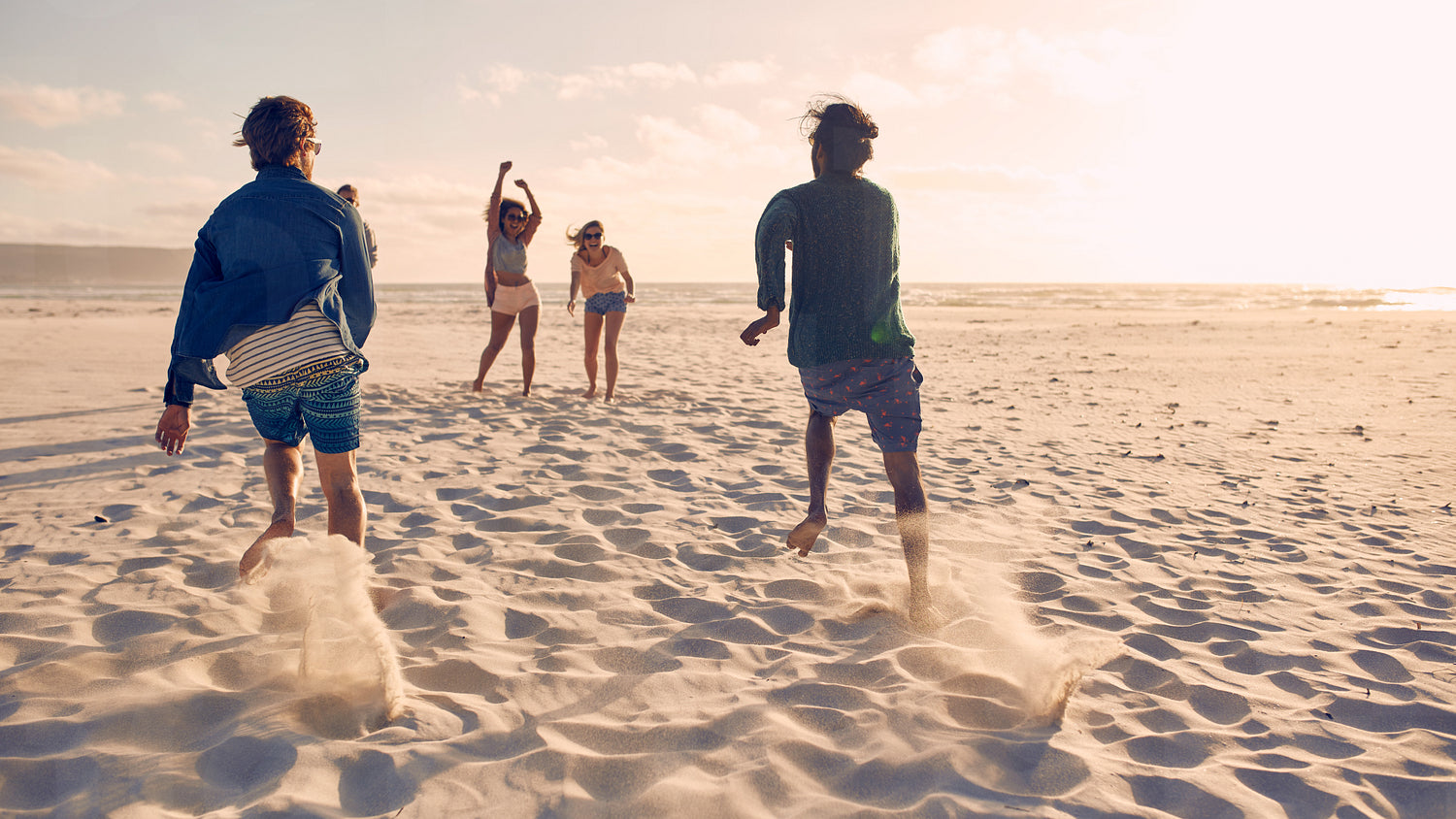 Group of young people running and competing together on a sandy beach. Young men running a race on the beach.