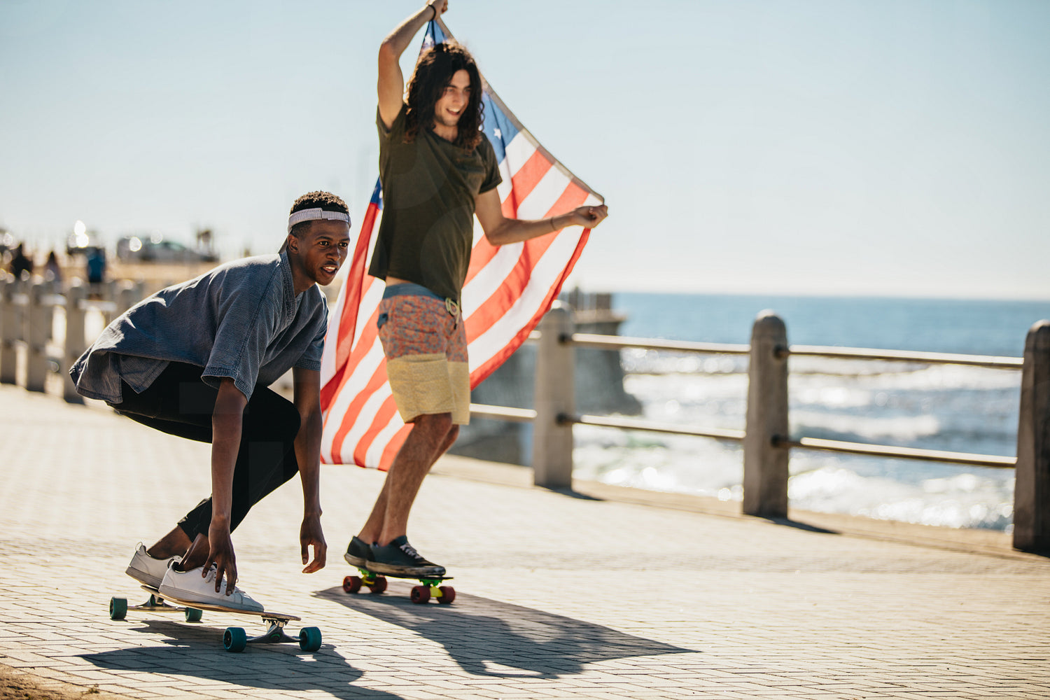 Two young skateboarder doing skateboarding with USA flag on the road by the beach. Multi-ethnic friends skateboarding on seaside promenade.