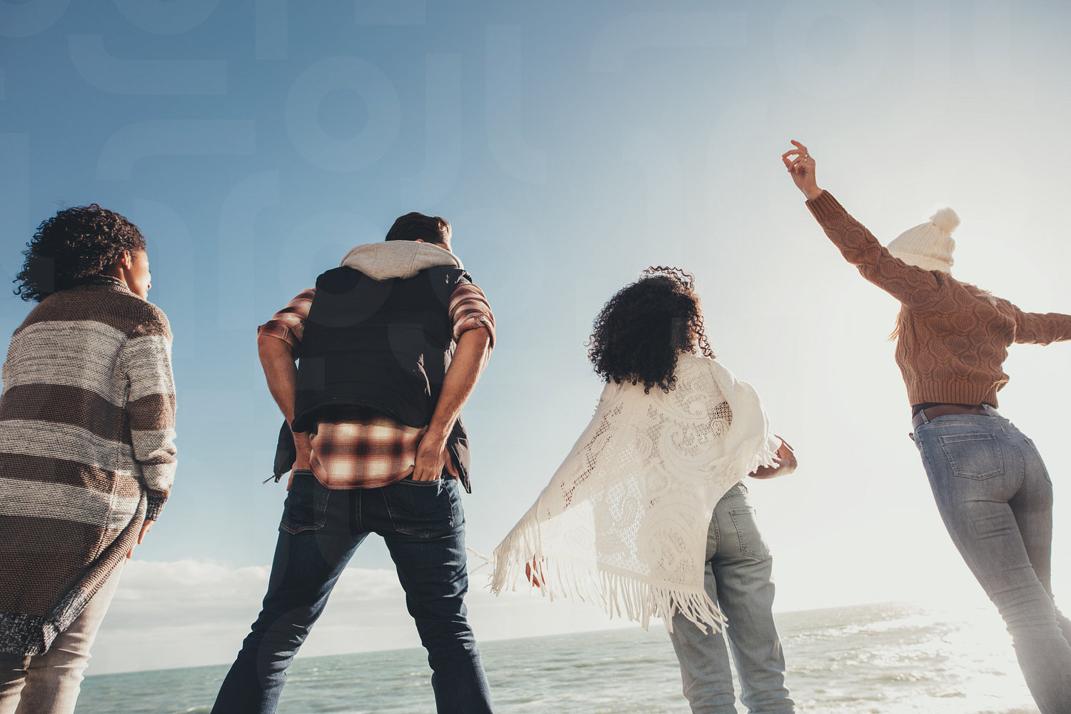 Rear view of friends standing outdoors on a sunny day. Group of man and women on vacation looking at sea.