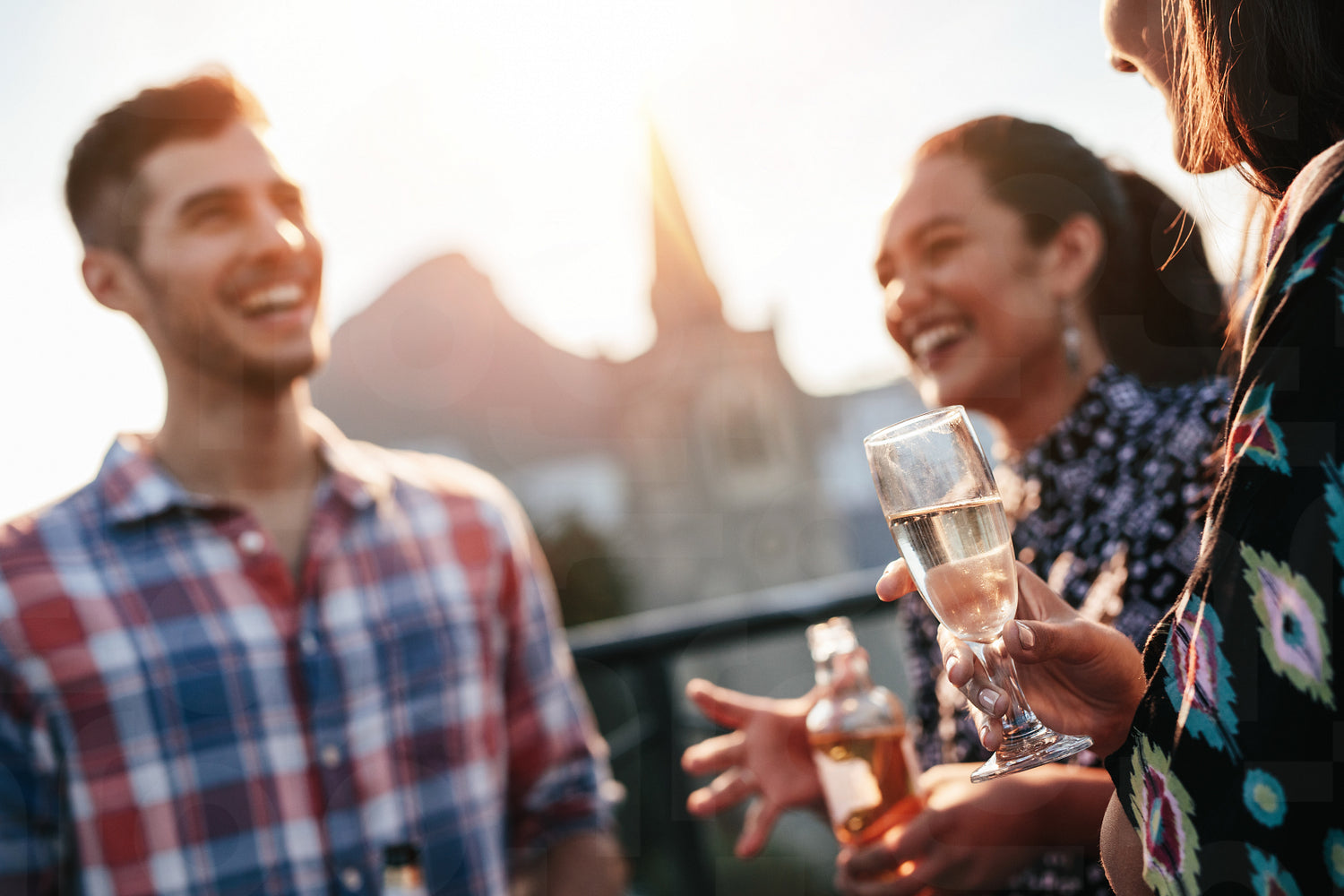 Friends standing together on rooftop with drinks and chatting. Young men and women having a rooftop party. Focus on champagne glass in women hand.