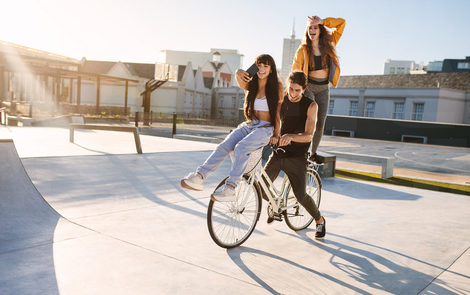 Man on bicycle with a female friend sitting on the handlebar taking selfie and another standing in back making loser hand gesture.