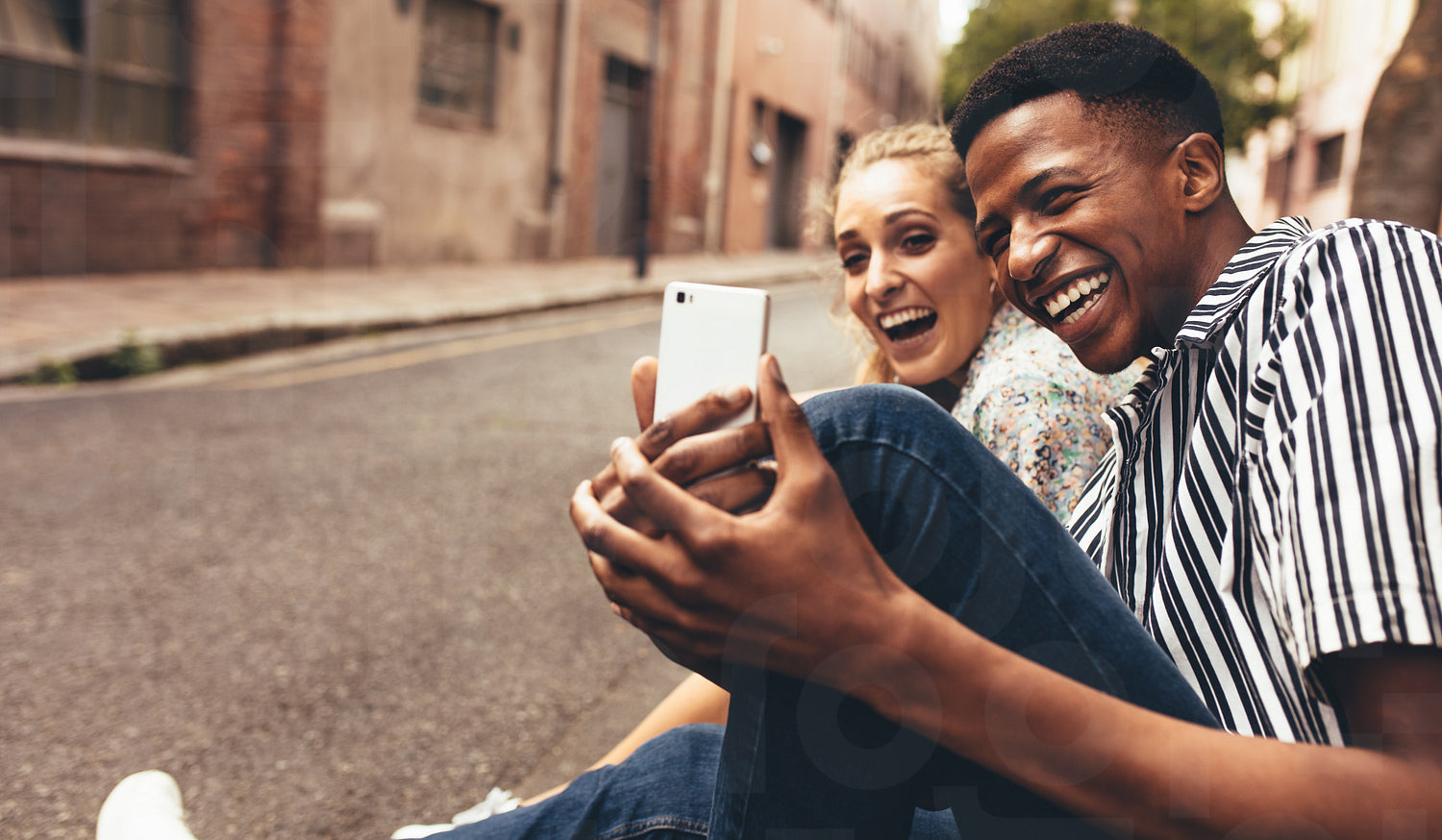 Man taking selfie with his female friend sitting outside by the street. Cheerful friends making a selfie outdoors.