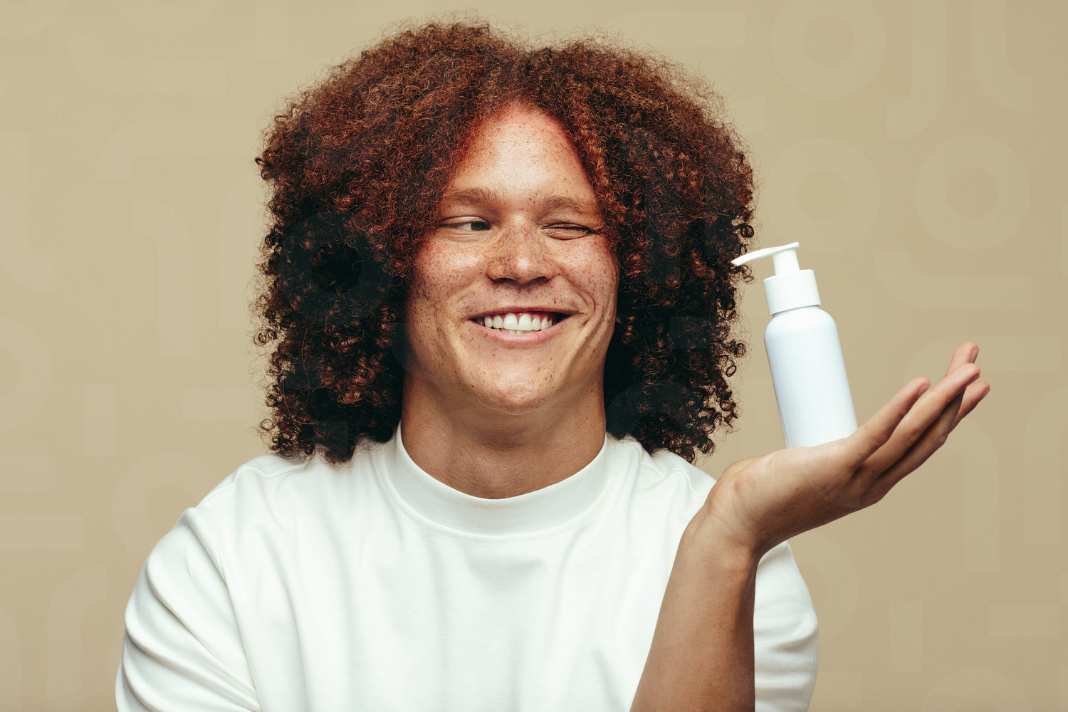 Young man having fun as he practices his skincare routine with a face serum. Man with a curly afro smiling and winking while holding a bottle of a moisturizing beauty product.