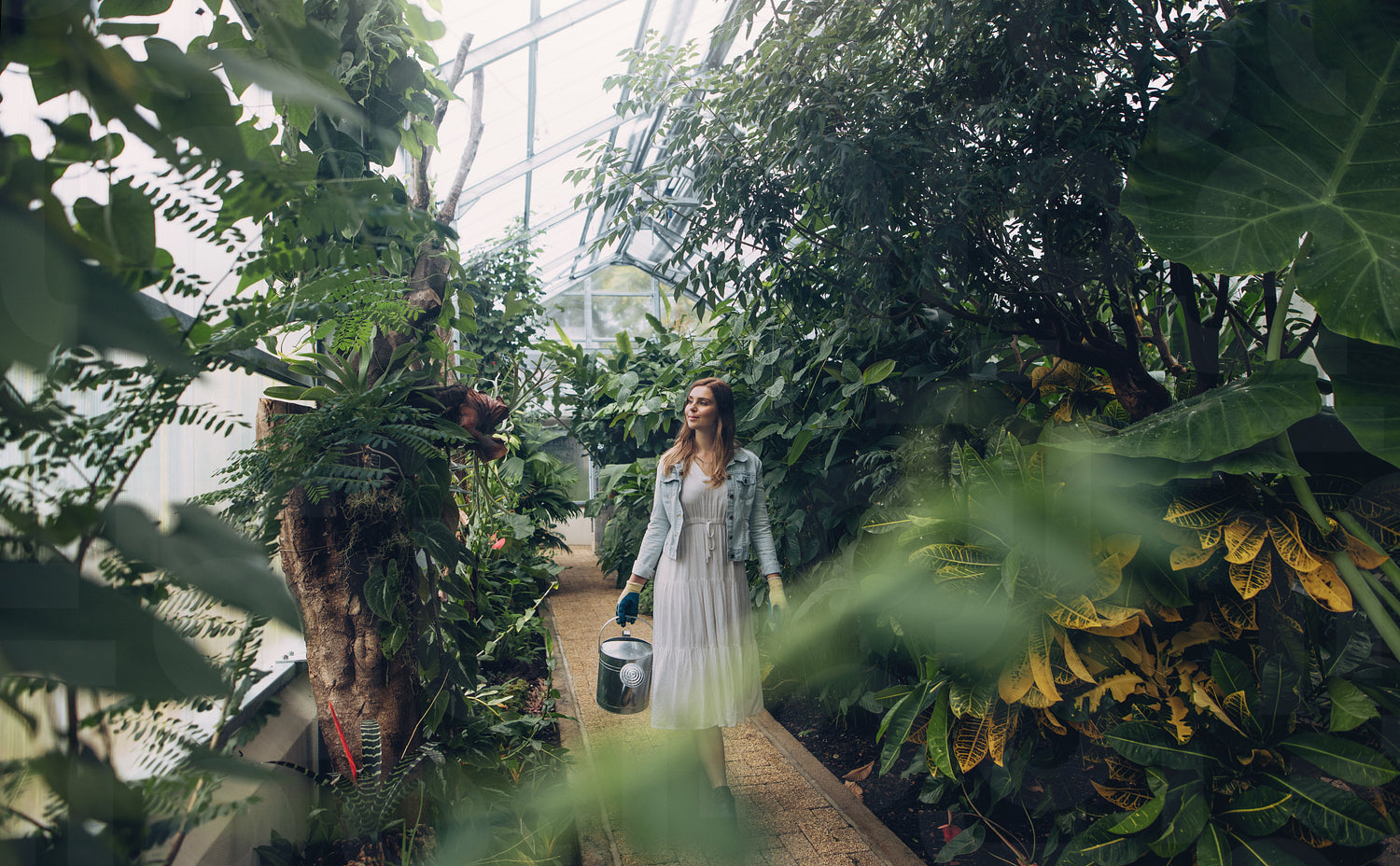 Young woman with watering can walking in botanical garden. Caucasian female gardener taking care of plants at greenhouse.