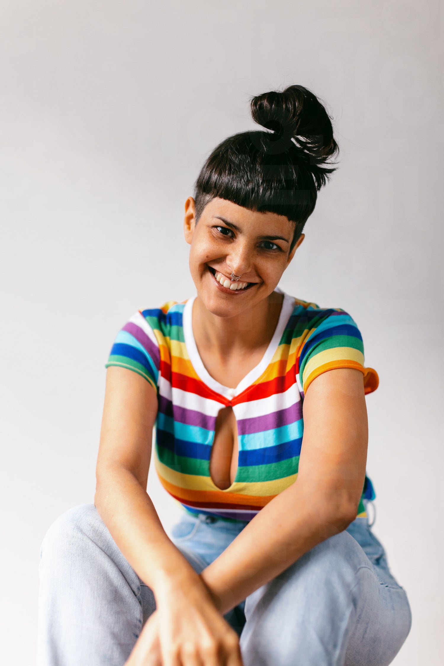 Gay woman celebrating pride in a studio. Happy young lesbian woman smiling at the camera while sitting against a studio background. Young woman wearing a tank top with LGBTQ+ rainbow colours.