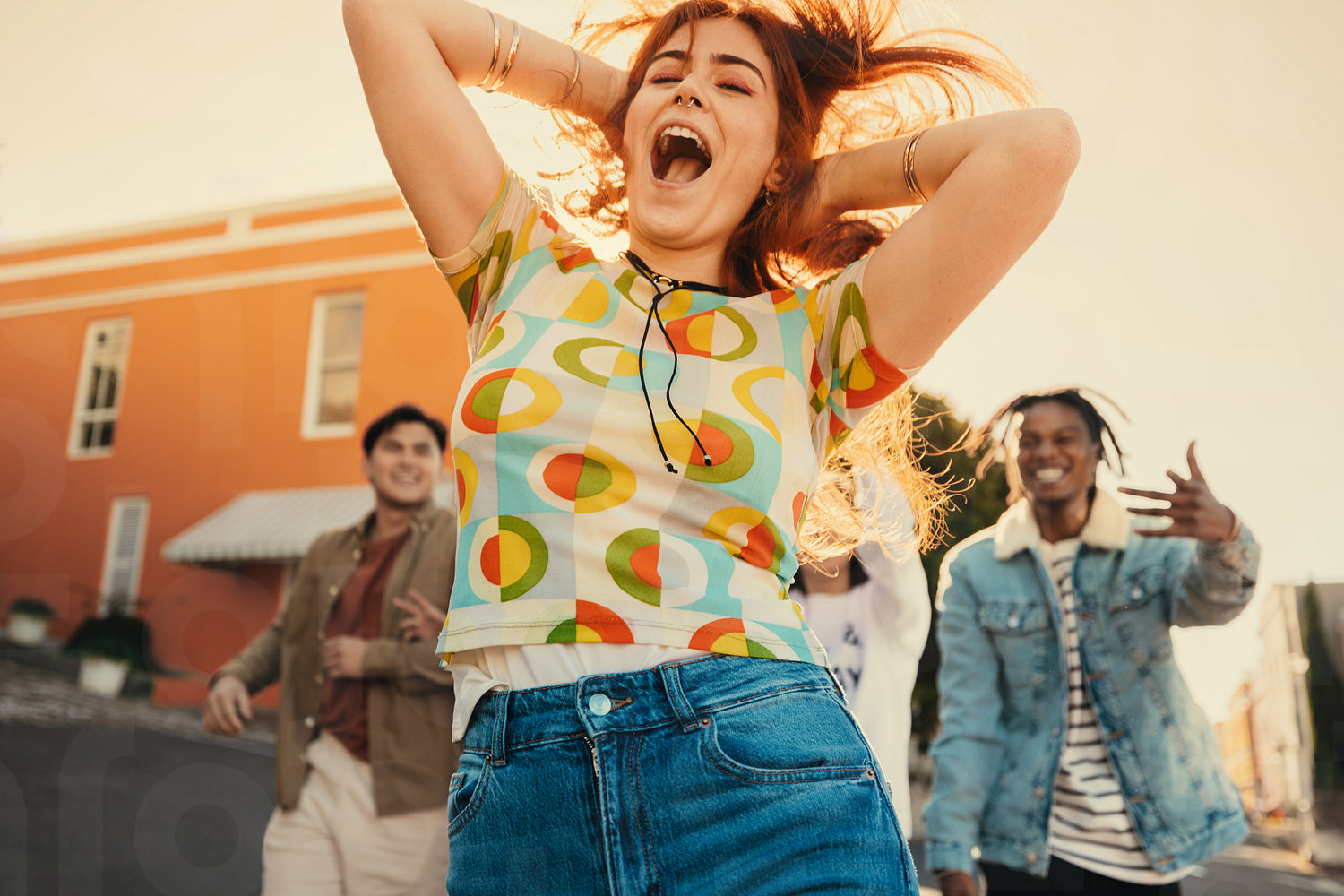 Gen Z group of friends having fun dancing and recording a lively moment for social media. Woman leading the dance outdoors.