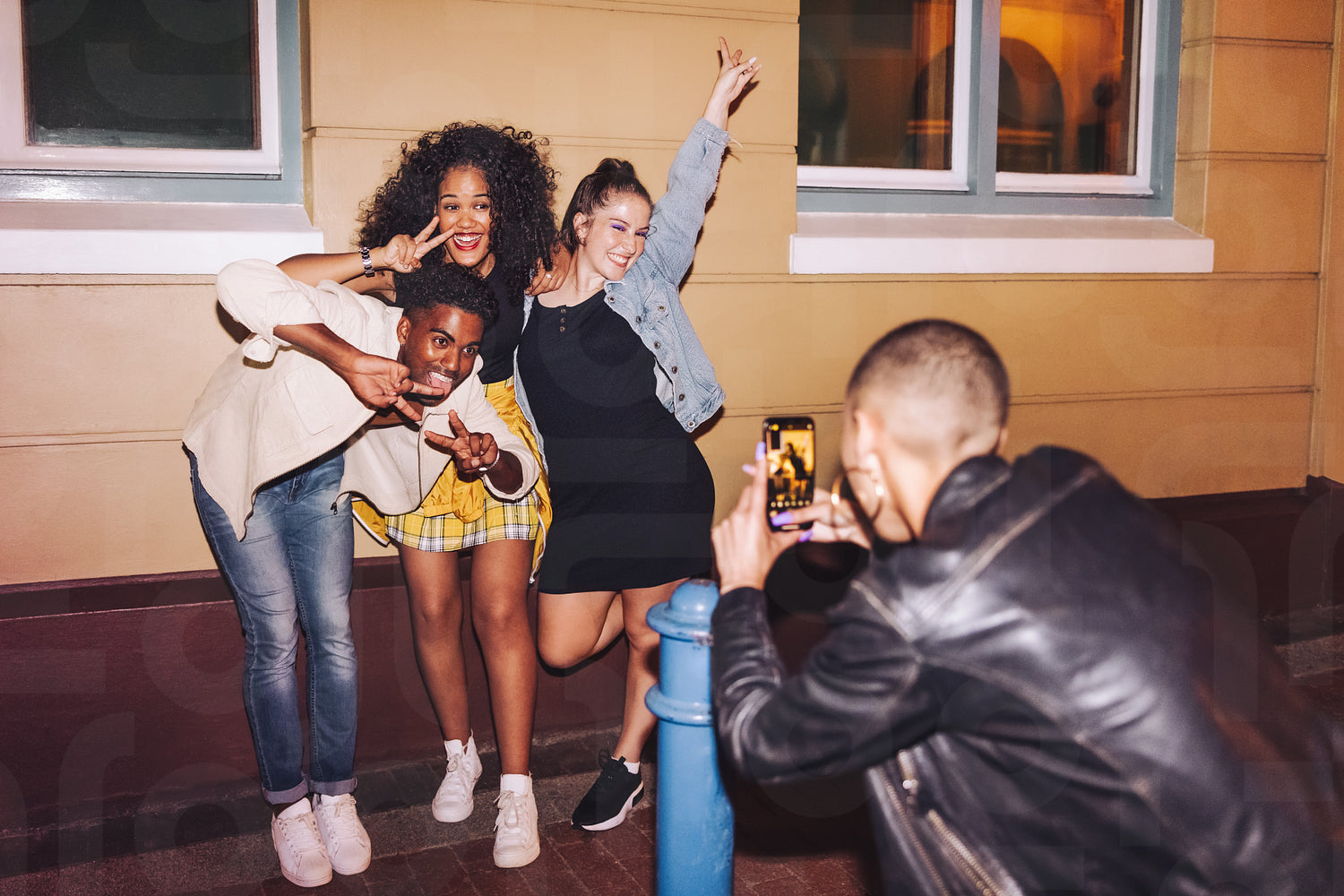 Generation Z friends posing for a photo in front of a camera phone. Group of multicultural friends having fun while hanging out together at night. Young people making happy memories on the weekend.