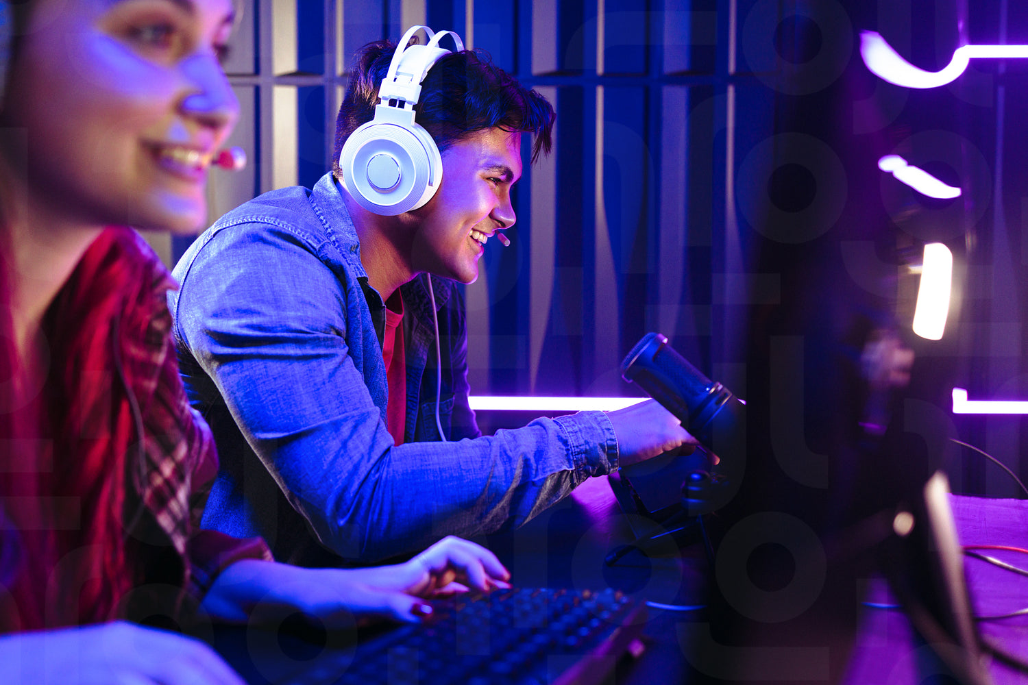 Gen Z gamers contesting in an online video game, with a microphone to live record the competition on a streaming platform. Two happy young people playing competitive esports on their computers.