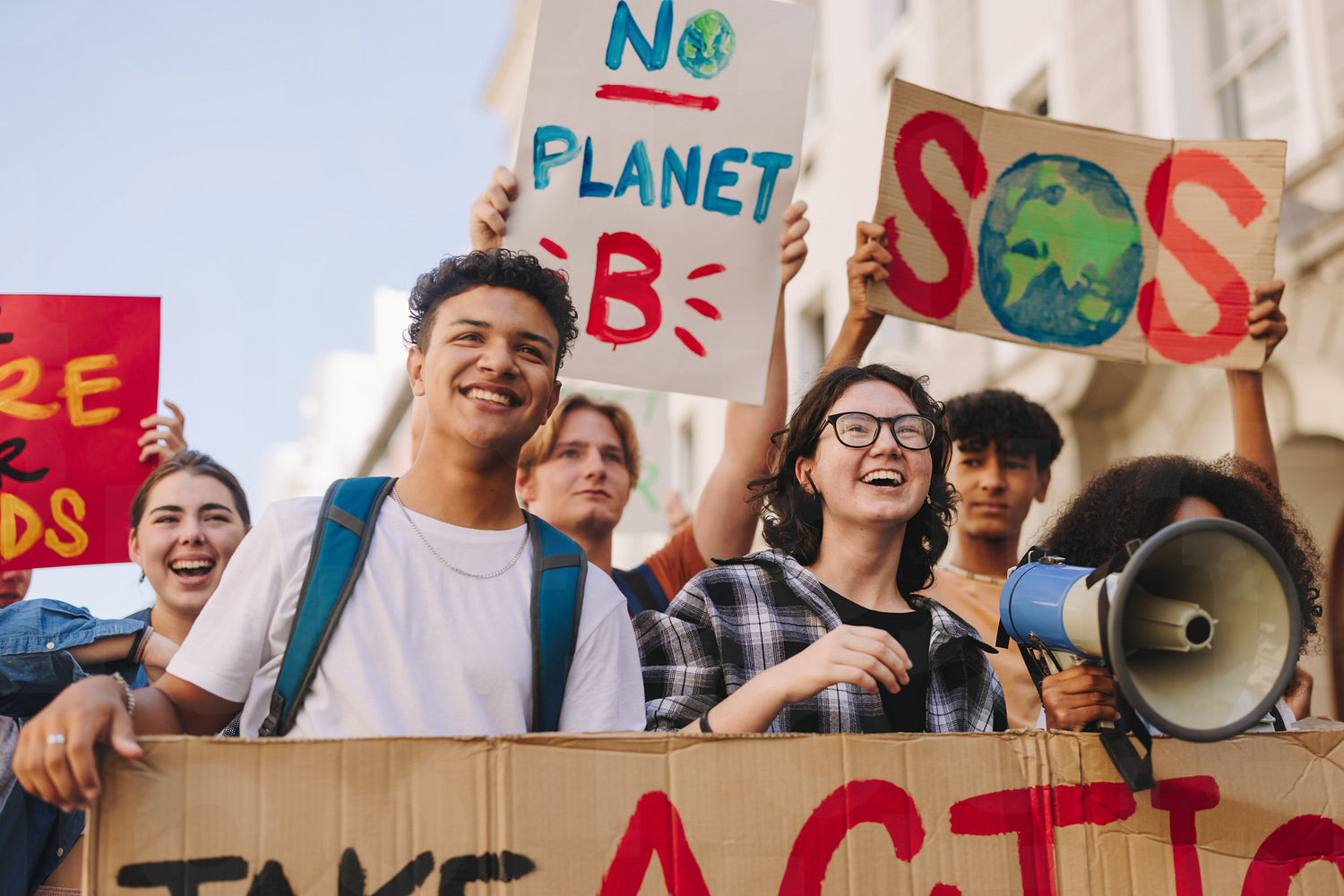 Generation Z environmental activism. Happy young people holding posters and banners while marching against climate change. Multicultural youth activists campaigning for climate justice.
