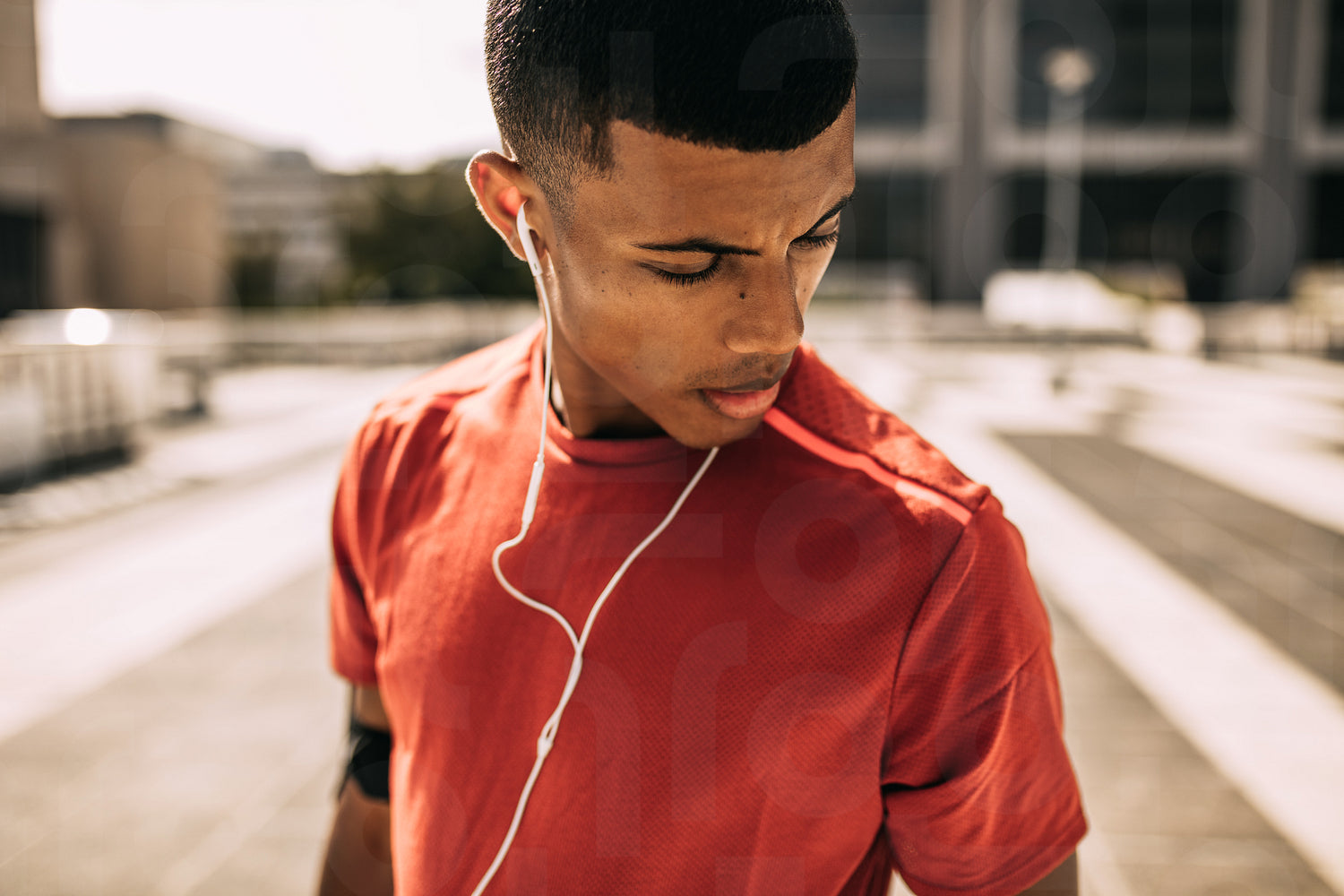 Healthy man wearing earphones looking down before exercising outdoors. Fitness male in sportswear getting ready beofre workout in the city.