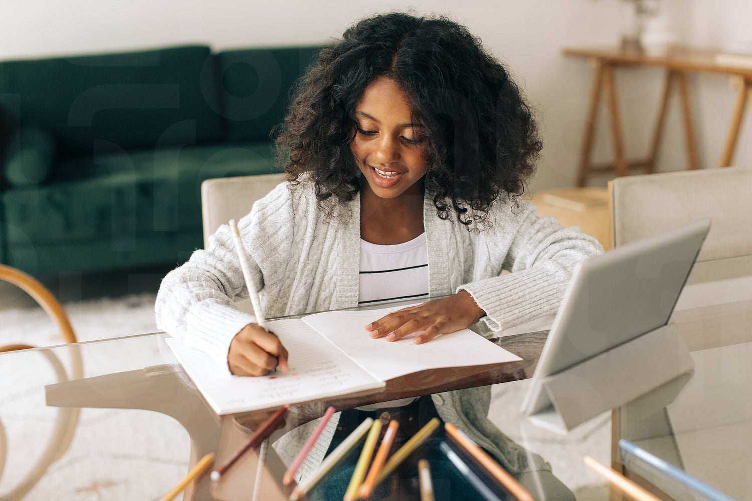 Young girl writing in her notebook at home. Girl sitting at table and completing her homework.