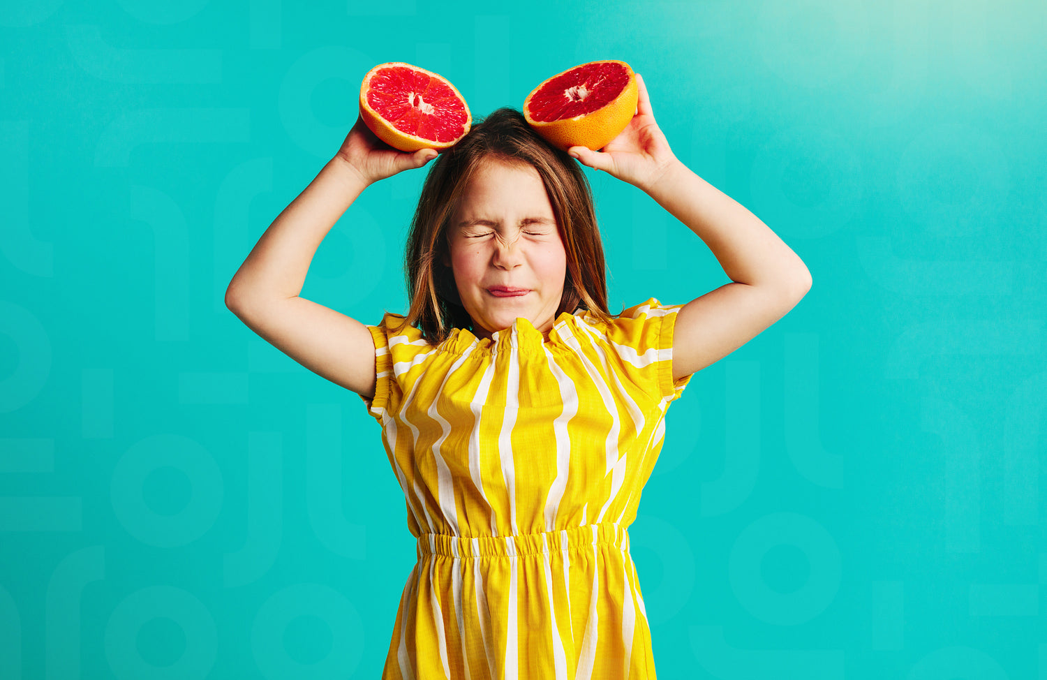 Girl holding grapefruit overhead on blue background. Cute girl does not like the taste of grapefruit.