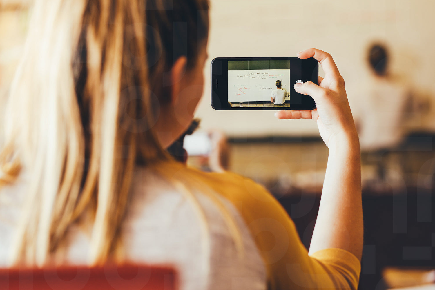 Rear view of a female student taking pictures of blackboard during the lecture. Girl filming the important lecture by a teacher in classroom with her smart phone.