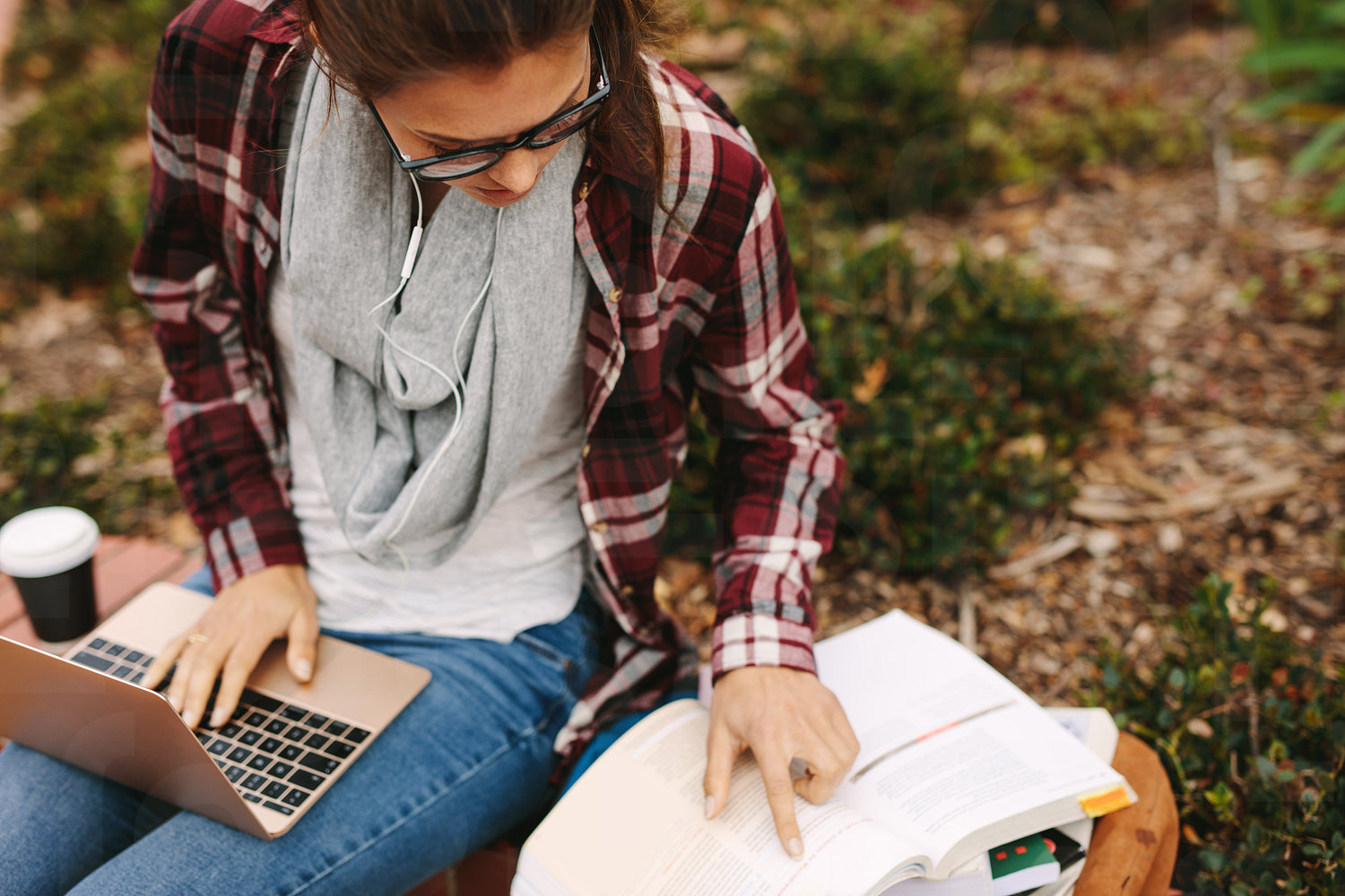 Girl student preparing for exams at college campus. Female student studying at university campus, reading book and working on laptop.