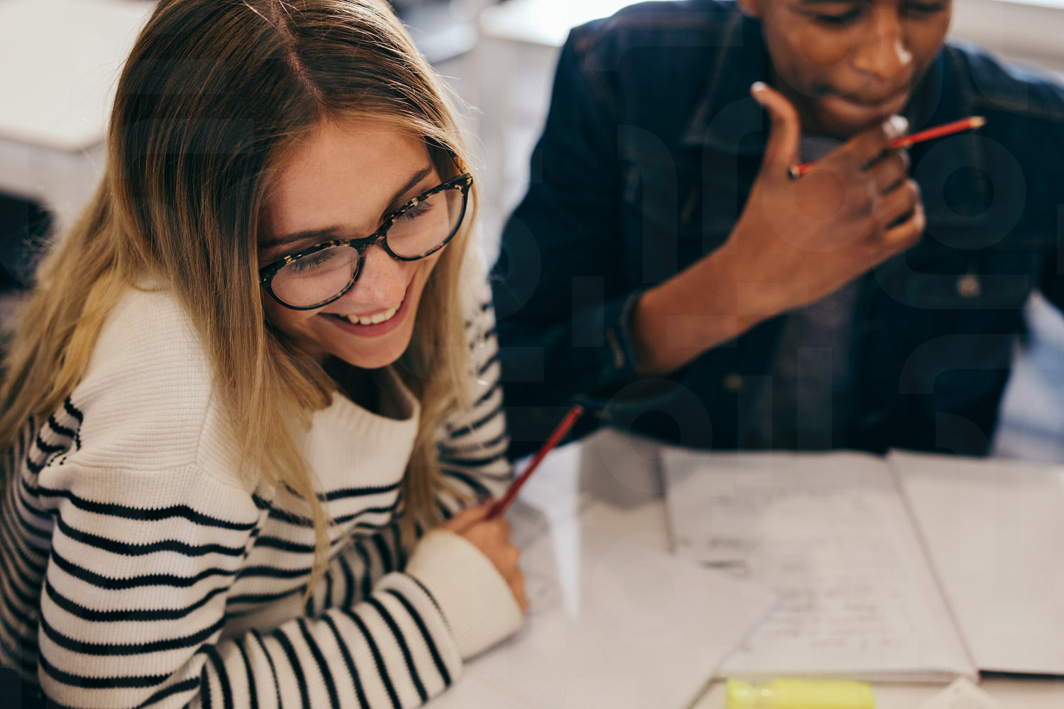 Smiling girl talking with her friend while studying at table. Students with books preparing their class assignment in library.
