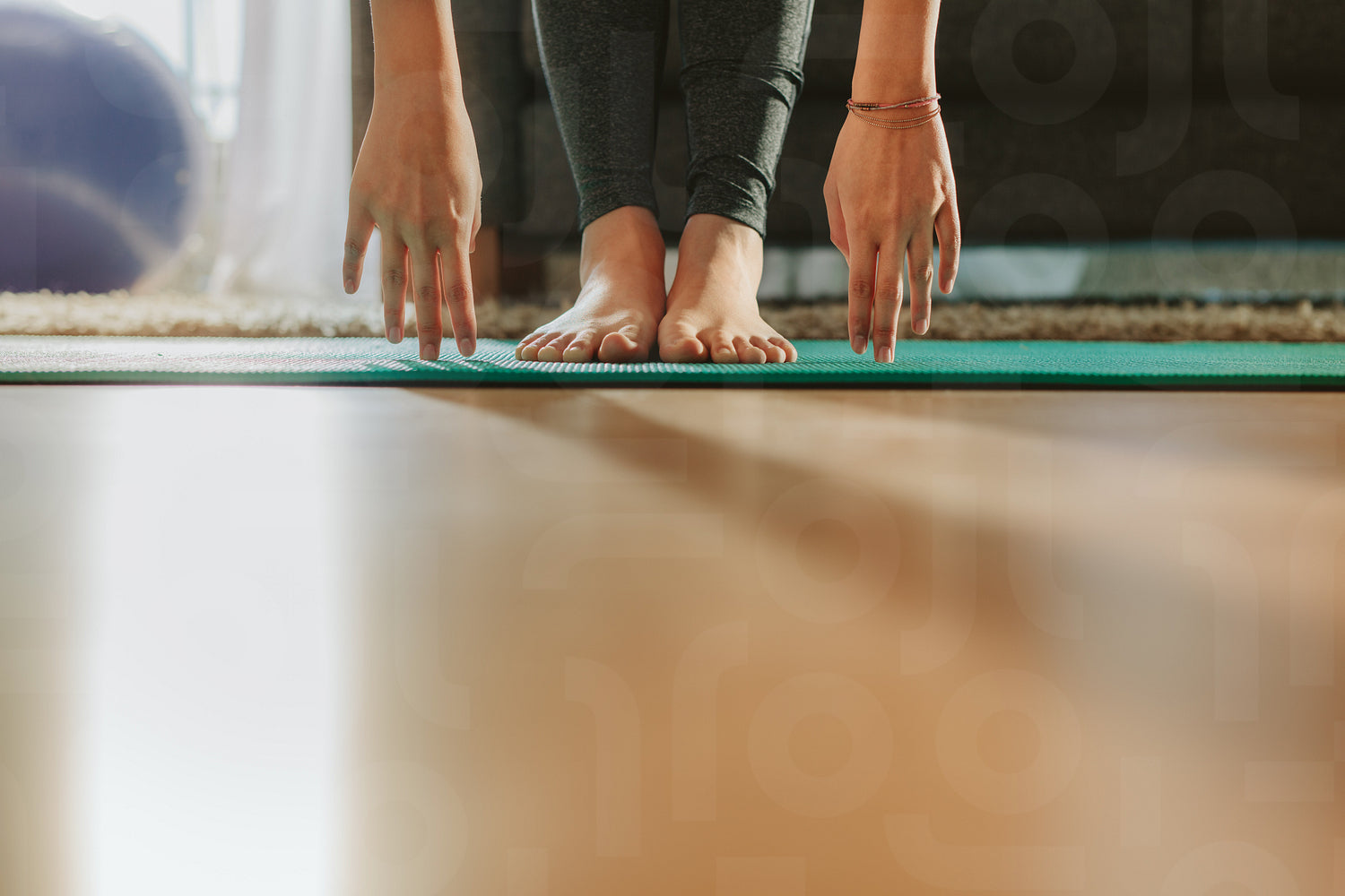 Low section view of female exercising indoors. Feet of women bending down with hands touching the floor. Cropped shot of female feet and hands bending forward and training on mat at home