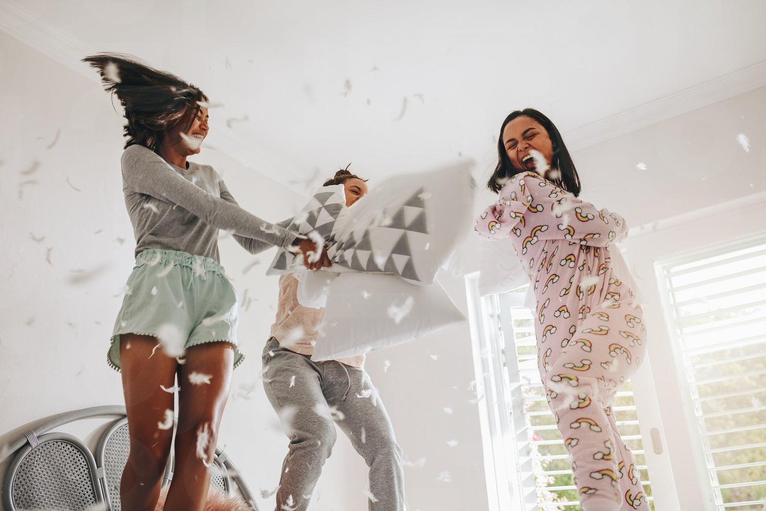 Three girls fighting with pillows standing on bed with feathers flying everywhere. Girls enjoying pillow fight standing on bed at a sleepover.