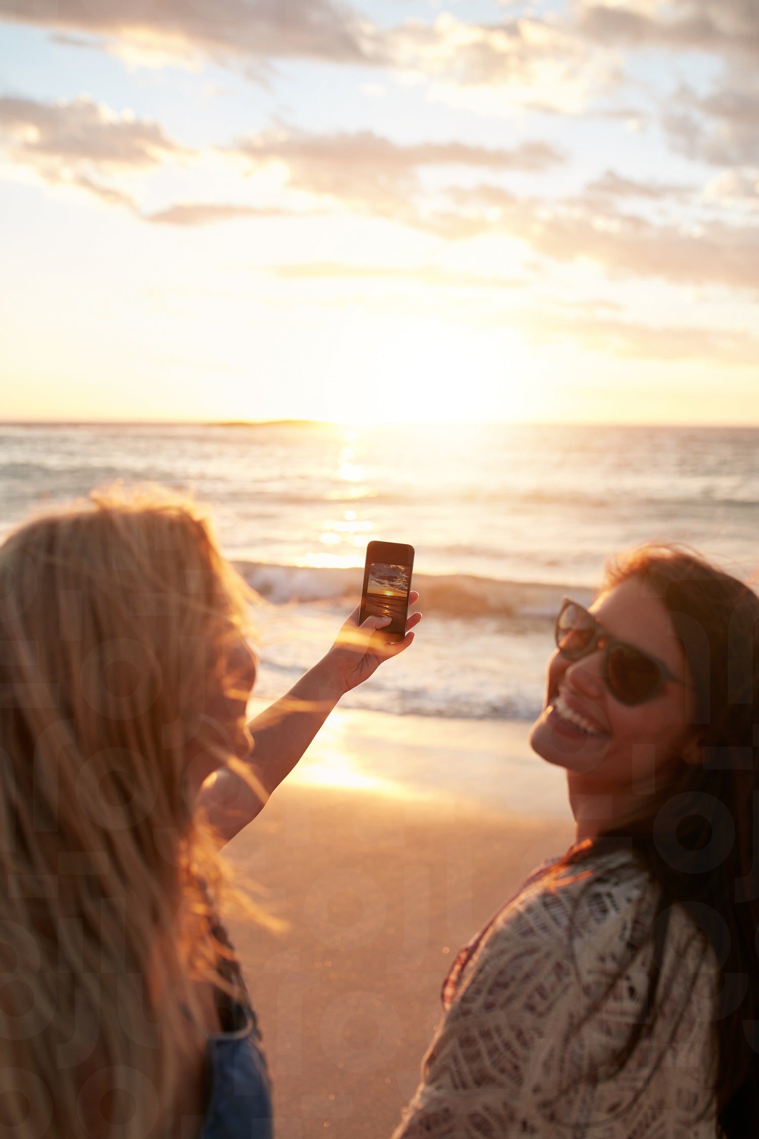 Girls taking a photo of the sunset with mobile phone. Two young women with mobile phone taking pictures of a sunset at the seaside.