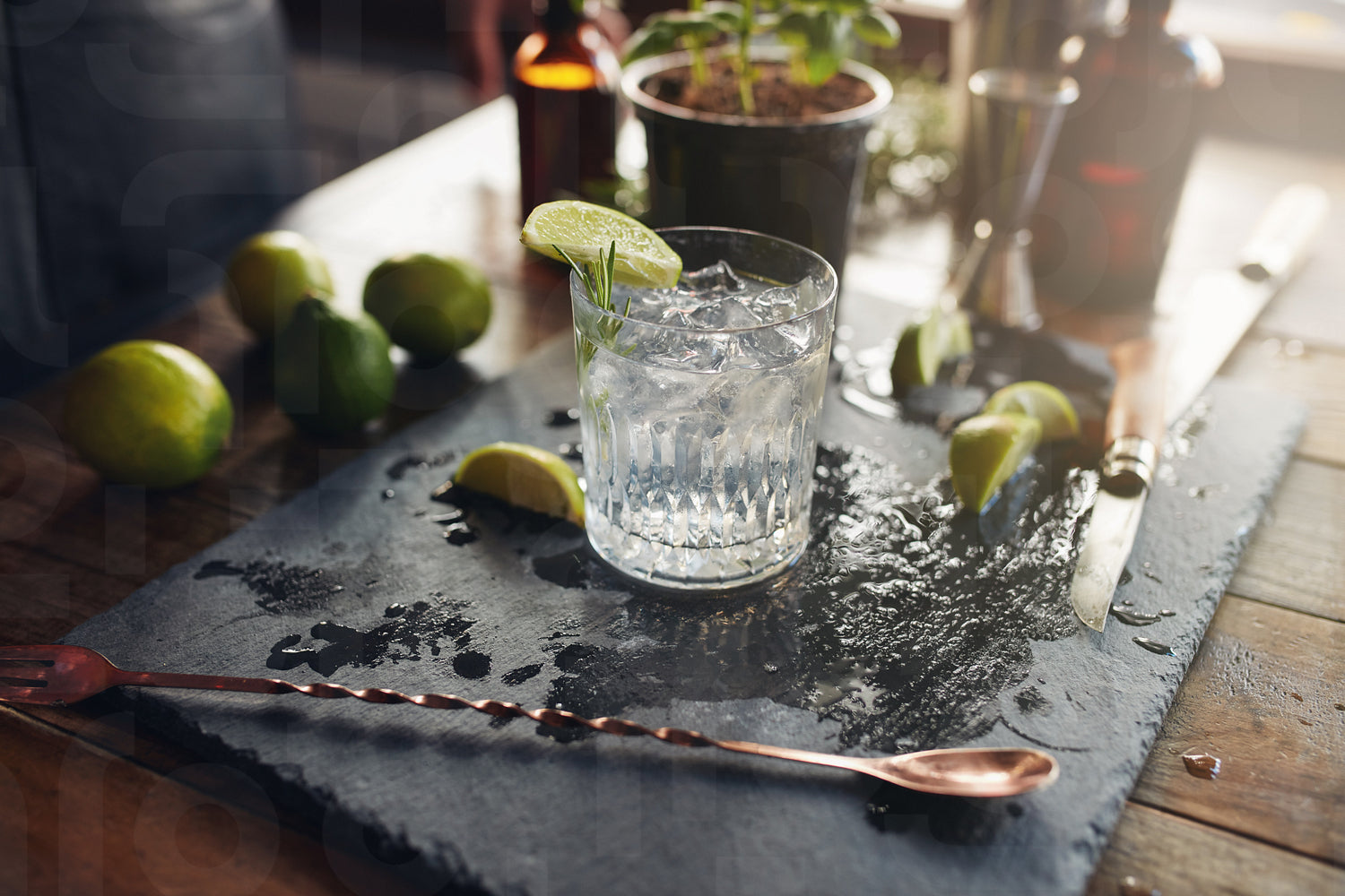Close up of glass of a freshly prepared gin and tonic with lemon slices and spoon on the counter.