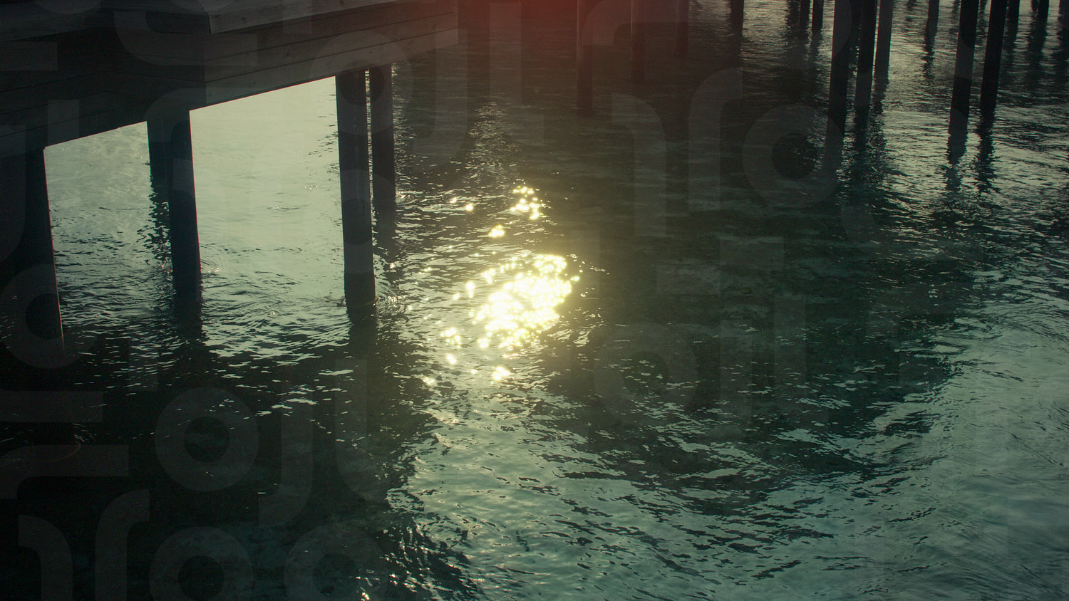 Golden sunlight reflections on calm tropical water under a serene pier in the morning