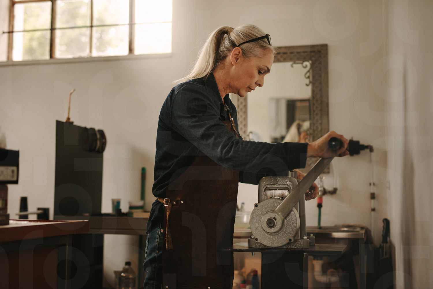 Mature woman goldsmith crafting metal on craft rolling machine. Senior female using traditional metal rolling machine in jewelry workshop.