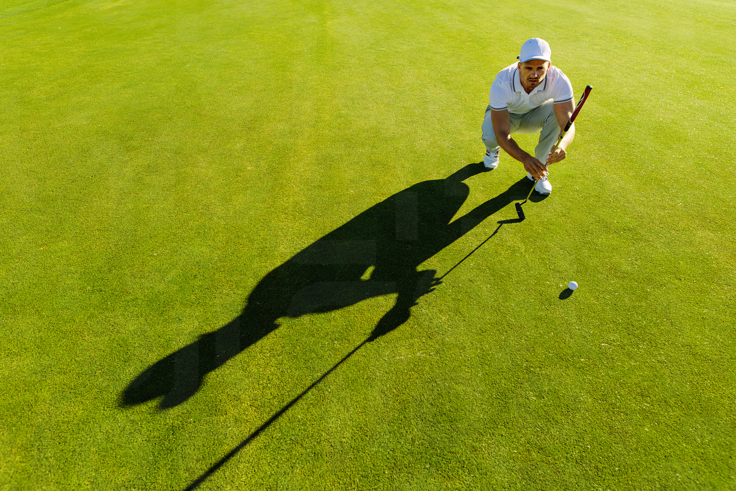 Golf player aiming shot with club on course. Male golfer check line for putting golf ball on green grass.