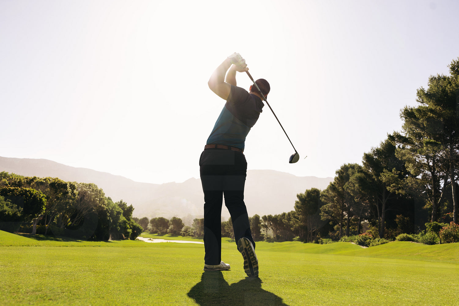 Golfer swinging a golf club with powerful follow-through on a sunny fairway