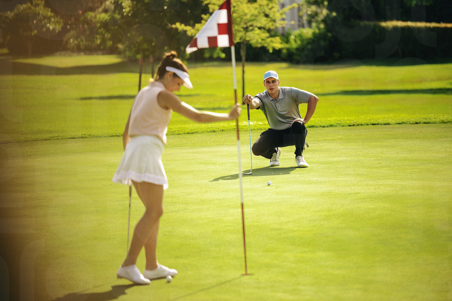 Two golfers on the putting green, with one crouching and aiming near the flagstick, showcasing teamwork and focus under sunny skies.