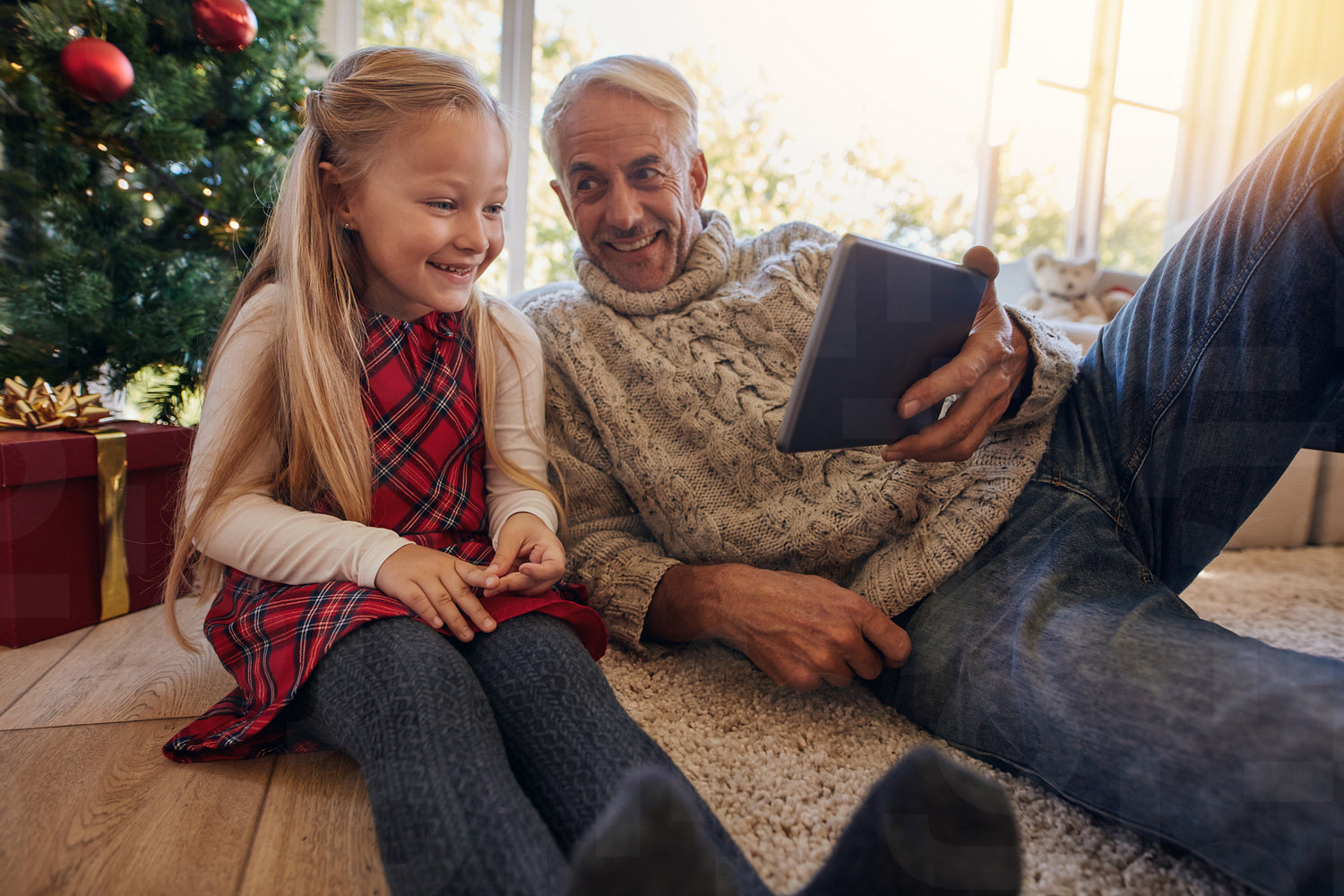 Grandfather and granddaughter sitting on floor and looking at digital tablet during christmas. Man with his little girl having a video on digital tablet.