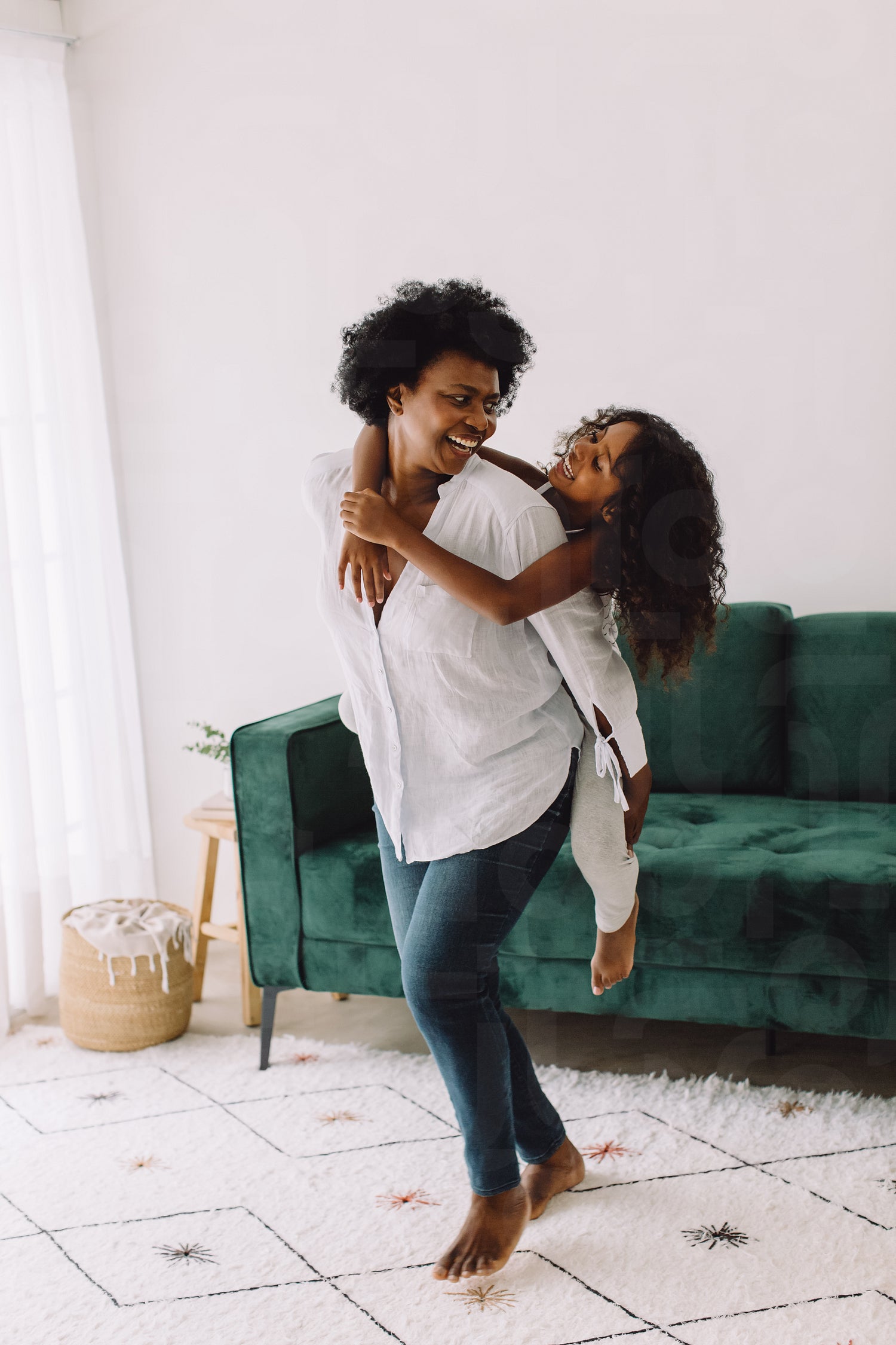 Grandmother carrying her granddaughter on back. Grandma playing piggyback with grandchild.