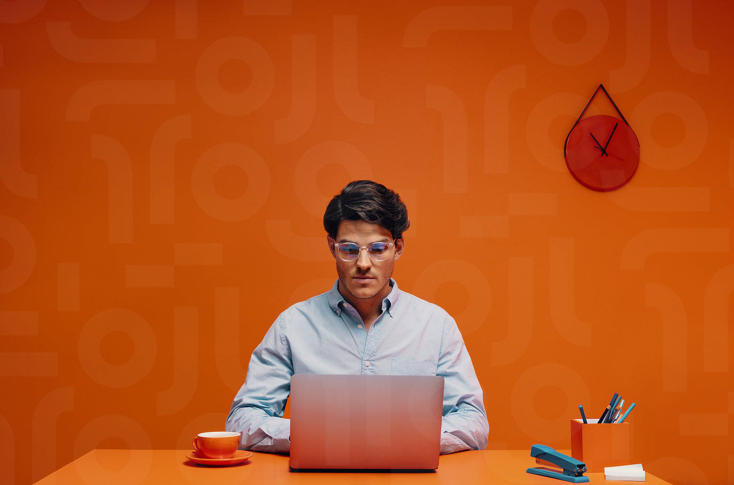 A freelance graphic designer working from his vibrant monochromatic home office, wearing eyeglasses sits at an orange desk working with a laptop, stationery, and a coffee cup.