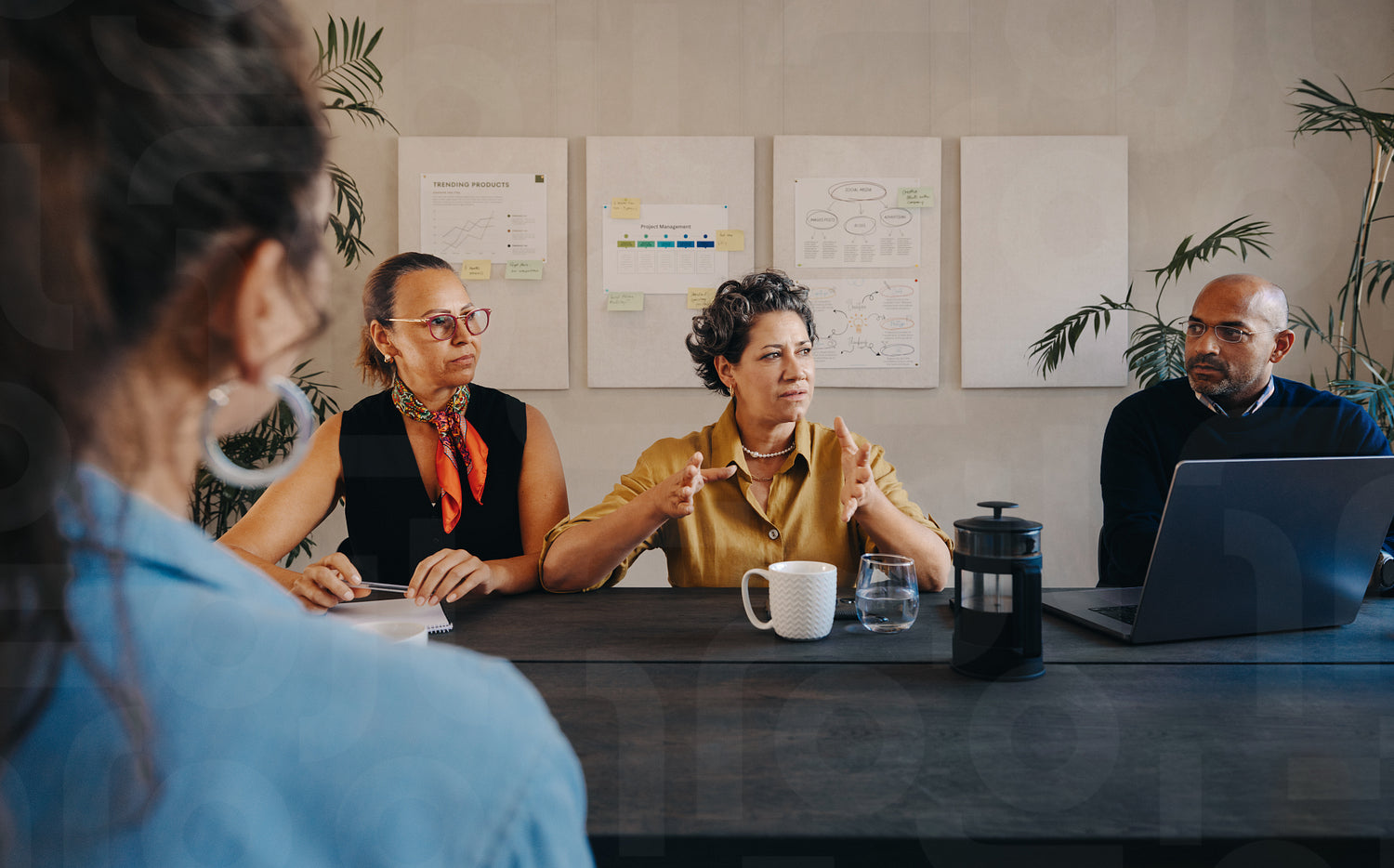 Board meeting featuring diverse team discussing ideas, with a mature businesswoman speaking and coffee on the dark wooden table, creating a sense of professionalism and collaboration.