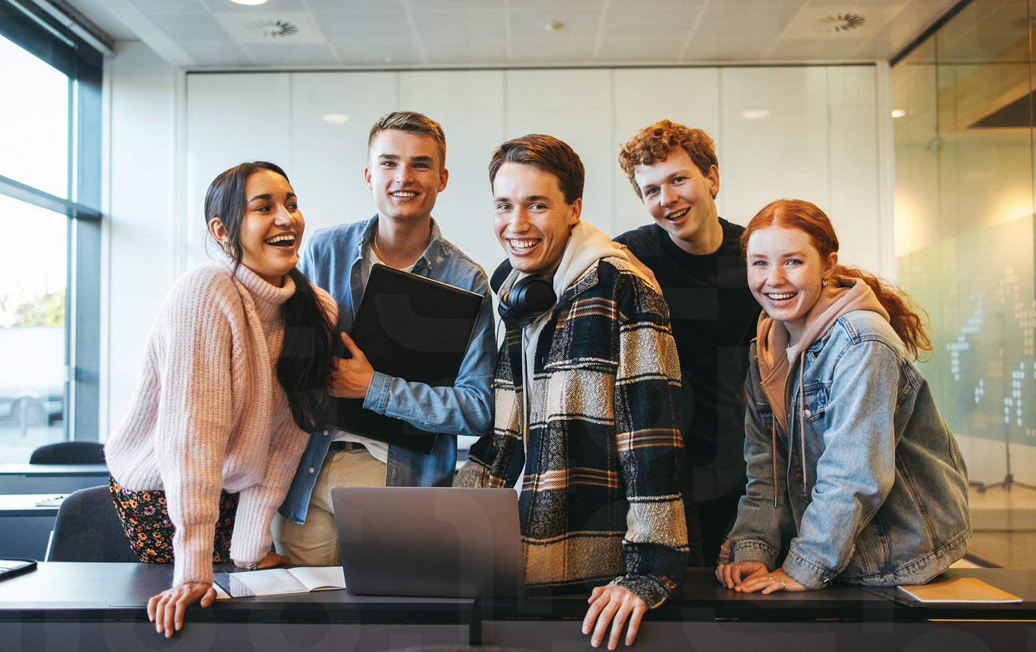 Cheerful group of students enjoying in a classroom and looking at camera. Young people in a classroom.
