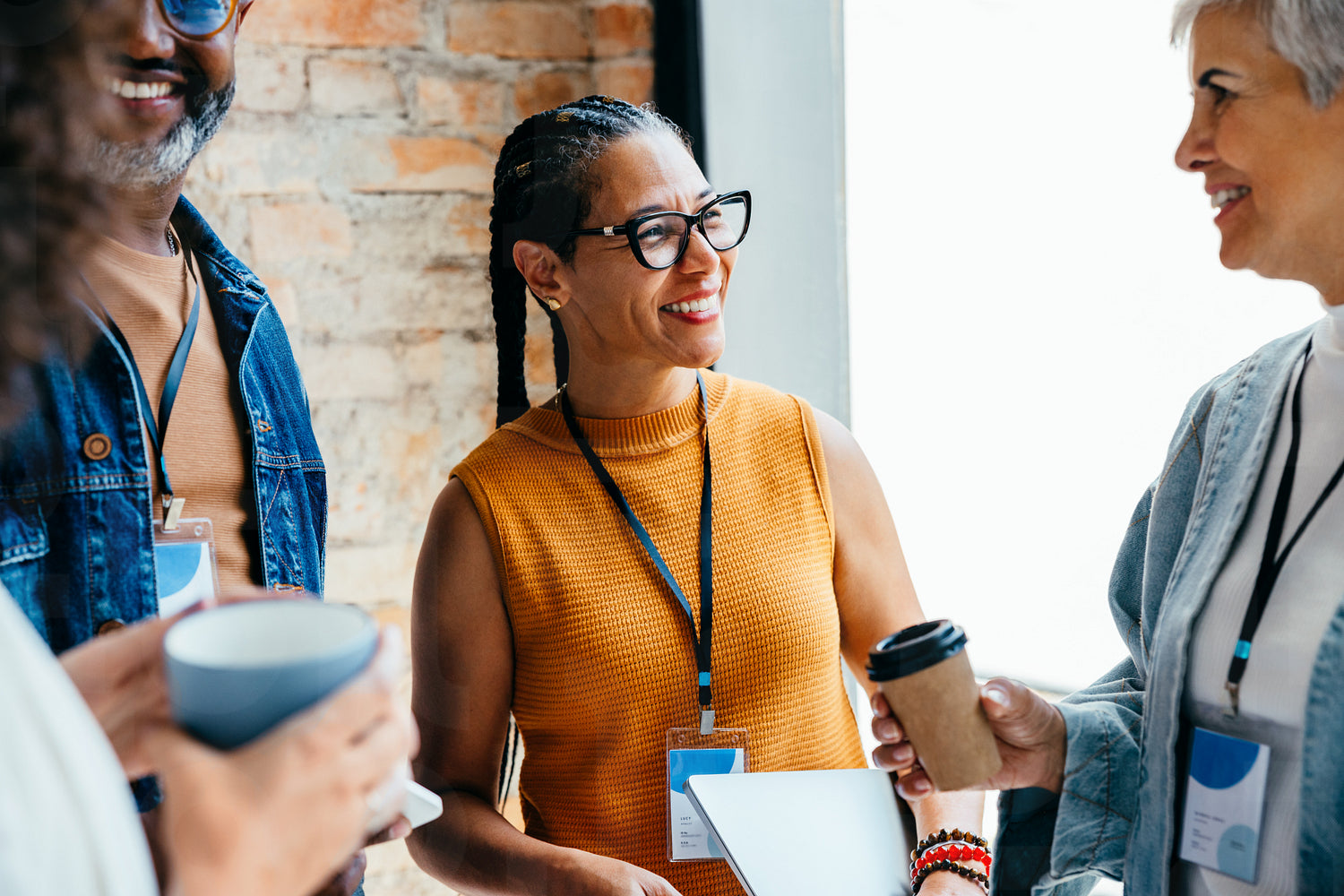 Group of colleagues having a friendly chat with coffee during a break at the office. The setting is informal and friendly.